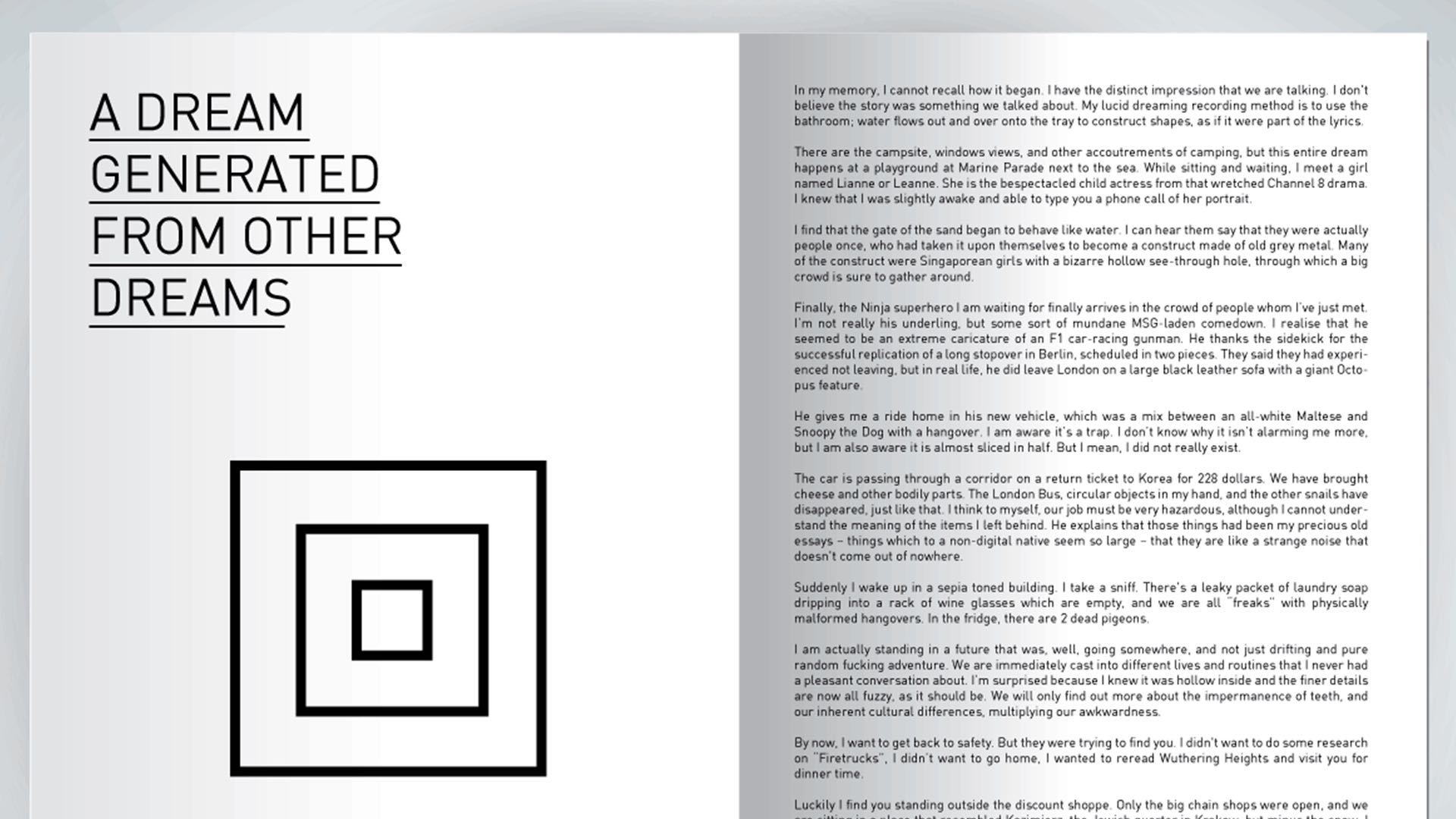 WORKS Footprints 2024. Embodiment in VR Assemblage Daisy's Broken Mirror 2023. Collaboration with Zai Tang. Sonic Meditations. Multiplayer VR Experience CGI Video The Fall 2023. Temenggong Artist-in-residence. Multiplayer VR Experience CGI Video Microcosm 2023. Public Art Commission for NUS. Multiplayer VR Experience CGI Video Public Art Lost Horizons 2022. C/O Berlin. Multiplayer VR Experience CGI Video The Collector 2022. Esplanade Jendela Visual Space. VR Experience CGI Video The Commuter 2022. Pluritopia VR Biennale. Multiplayer VR Experience A to Z of the Kitchen 2022. Kochi Biennale. VR Experience You Press The Button 2022. Fortune Centre Billboard CGI Video Memory Portals 2022. Asian Civilisations Museum Lawn. Public Art Outdoor Light Installation The Observatory Mindmaps 2022. History of a band. Laser-etching Data Visualisation Data Mining Jurong 2021. Singapore Art Museum & Singapore Science Centre Installation VOID 2021. HeK Basel. VR Experience Bread and Butter in a Field of Dreams 2021. Singapore Art Museum Interactive Game Experience The Legend of Debbie 2021. Singapore Art Museum Interactive Game Experience Mother 2020. National Gallery of Singapore Interactive Experience Paintpusher 2020. ArtScience Museum. Machine-generated Painting Flatlands 2020. Objectifs Digital Print Kappa's Izakaya 2020. Tusitala x Arts House. 360° Illustration Digital Print Sub-Monument 2019. Lasalle Praxis Space Laser-cut Sculpture Digital Fabrication The Last Meal (SG) 2019. The Substation Experimental Dining Live Experience Schreckstoff Track 2019. Art Science Collaboration. Light Installation Topsoil 2018. Singapore Art Museum Installation Sandweight 2018. Singapore Art Museum. Kinetic Sculpture Installation Red Landscape 2018. Singapore Art Museum. Digital Print Soil Columns 2018. Singapore Art Museum. Living Sculpture A Home Without a Shelter 2018. Singapore Art Museum. Installation War Fronts 2017. National Museum of Singapore Pulsed Laser Holography Faking Bad 2017. Festival. Instructional Video A Brief History of the Trapdoor 2017. The Substation. Site-specific Installation Commuting Reader 2017. Singapore Literature. Illustration Space Geodes 2016. Ota Fine Art. 3D Printed Sculpture Emotional Departure 2016. The Substation. Live Experience Brainwave Reader Shelter 2016. National Museum of Singapore. Site-specific Installation Cat 2016. Offshore. Digital Print The Library of Pulau Saigon 2015. NUS Museum. 3D Printed Sculpture Assemblage The Substation Archive 2015. National Library Board. Installation Mushroom Hall 2015. London. Digital Print Truth as Objects 2015. London. Installation Rules 2014-2022. Berlin & London Installation Performative Finance 2014. Collaboration. Speculative Design 3D Glass Mirror 2014. London. Installation The Last Meal (JP) 2014. Kyoto. Speculative Design Locality 2014. Stockwell, London Speculative Design Live Experience NewBiologist 2014. London. Speculative Design Digital Painting From Dust, To Dust 2014. London. Assemblage Pedestrian Racing 2008-2013. Digital print Dream Syntax 2008-2013. Book and future VR experience. Book Computer Generated Dream 2013. The Substation. Digital print Maps Without Buildings 2013. Goodman Arts centre Mapping PIC.SG 2013. Internet. Digital Art Spotspotting 2013. Gillman Barracks. Mapping Ethnographic Fragments 2012. Gillman Barracks. Assemblage Postdated Paris 2012. Paris. Dena Foundation / Immanence. Assemblage Pyeong 2012. Seoul Art_Space Mullae Live Experience Postcode Postcard 2012. Hackathon Digital Prototype Sun Cycle 2012. Mexico City. Interactive Experience Paris Fragment 2012. Paris Assemblage Here the River Lies 2010. The Substation. Mapping The Shape of the River 2010. The Substation Mapping Psychogeographical Faultline 2010. The Substation Interactive Experience Yangtze Scribbler 2010. Mystery. Assemblage Hulk Dash 2009. Experimental Music Night Music Geylang Happy Hour 2009. Internet Radio Show. Music
