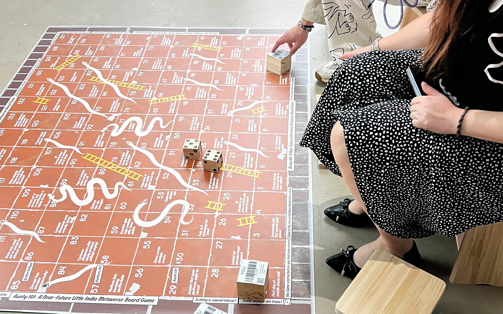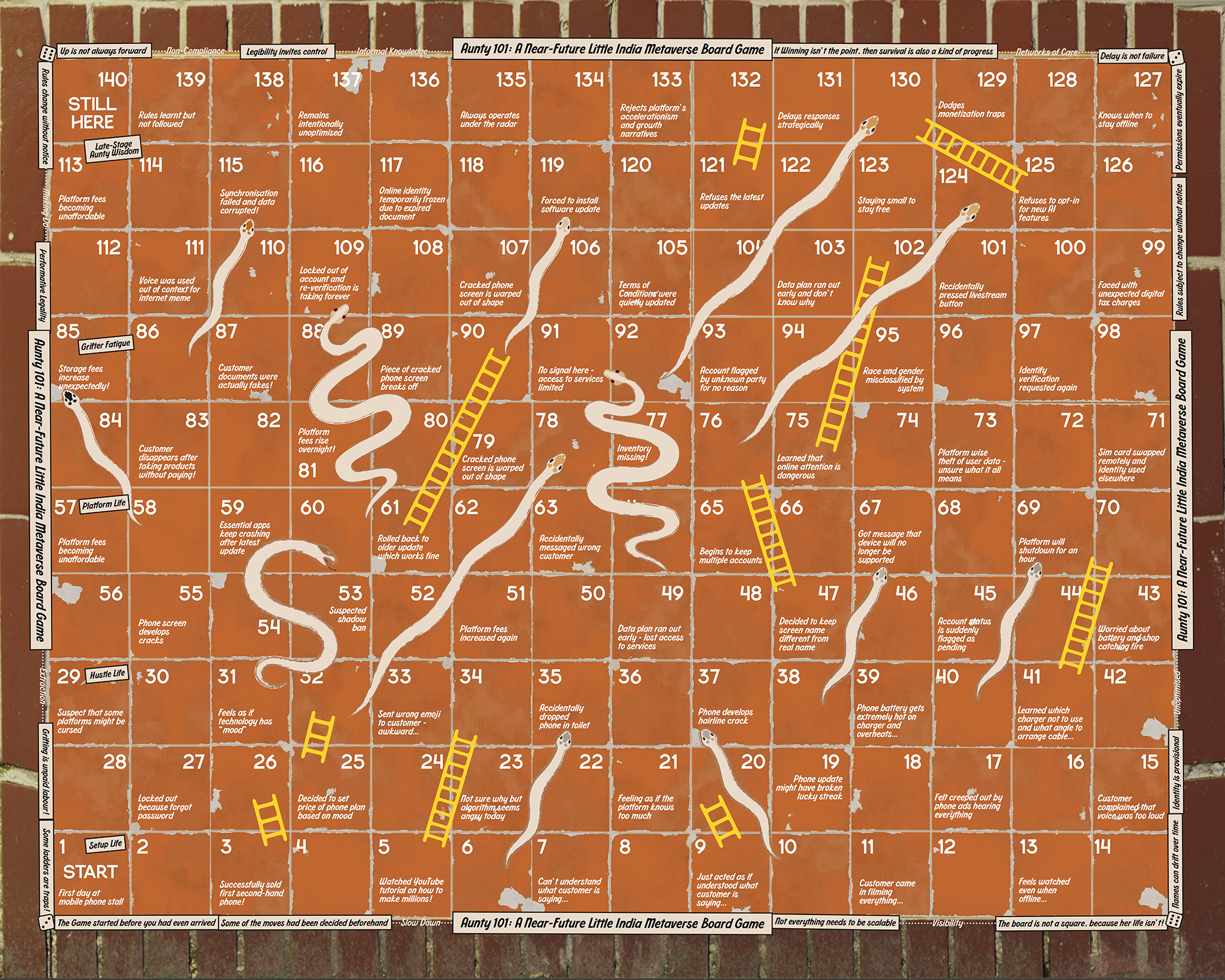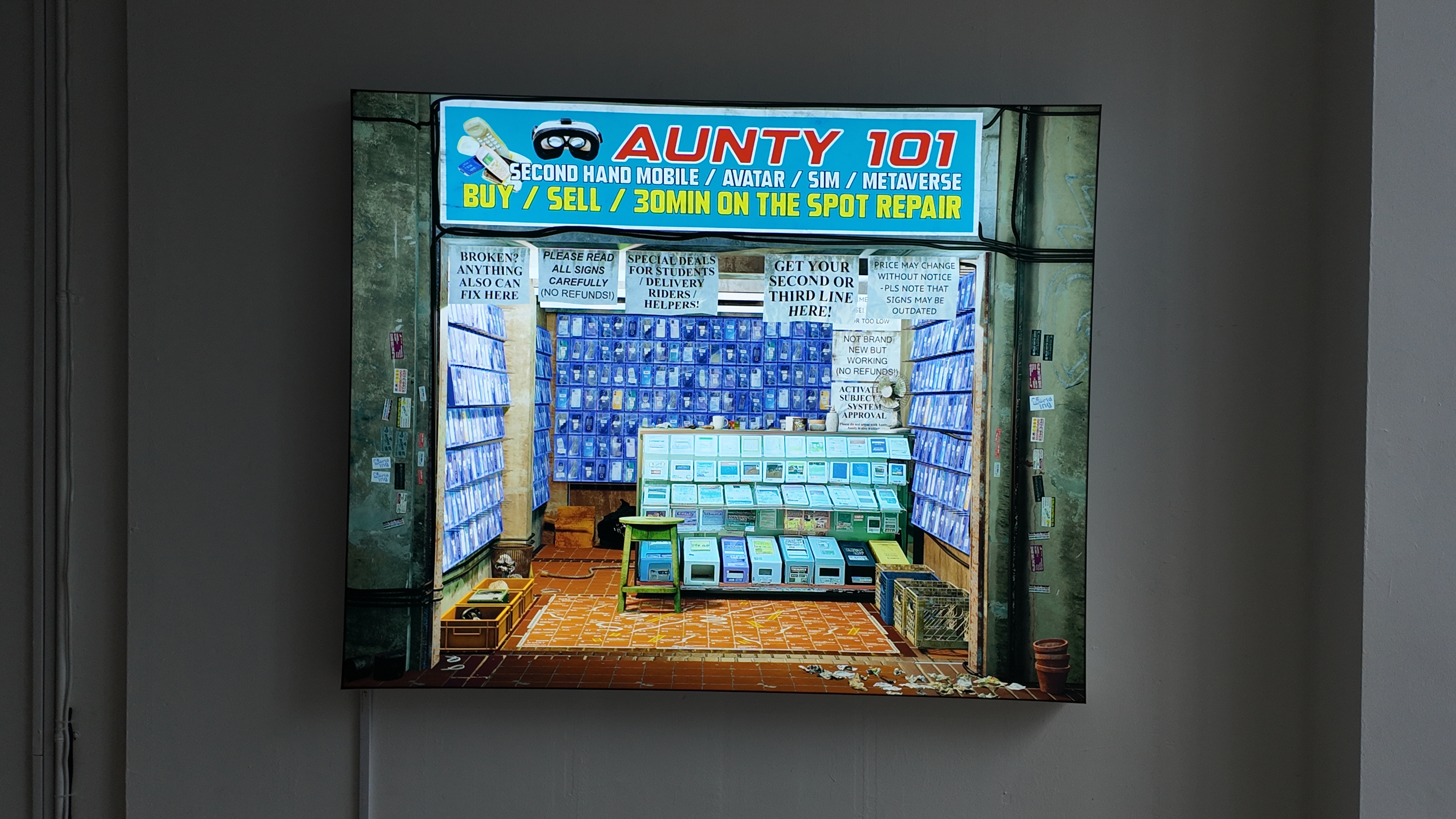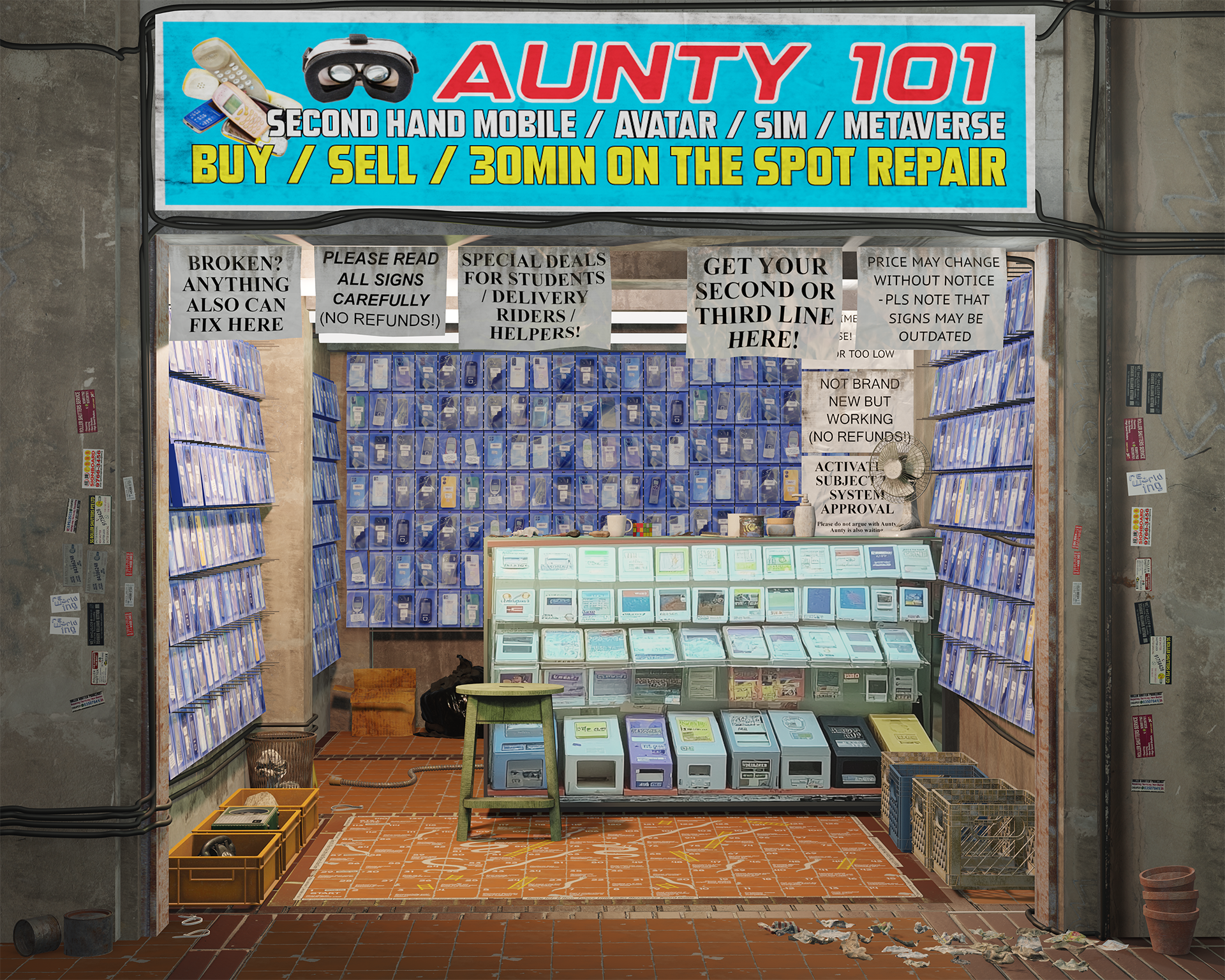 Aunty 101 is a zoom-in into a segment of a virtual world I have built called the Drift Alley—a speculative Southeast Asian cyberpunk back-alley world inspired by Little India in Singapore. The work was originally going to be a VR Game, but evolved into a board game that was about tech without having to have the tech in it. The Drift Alley is populated by precarious NPCs, side-hustlers, griefers, and micro-economies operating at the fringes of the metaverse: SideQuest HR firms, Auto-Fishing Shops, Loot Crate Pawnshops. Acting as a beginner’s guide to this unstable world, Aunty 101 is its oldest ghost, where she repairs misaligned limbs, haunted wallets, and leaky inventories while dispensing half-remembered wisdom. The work explores survival, care, and orientation within marginal digital futures.