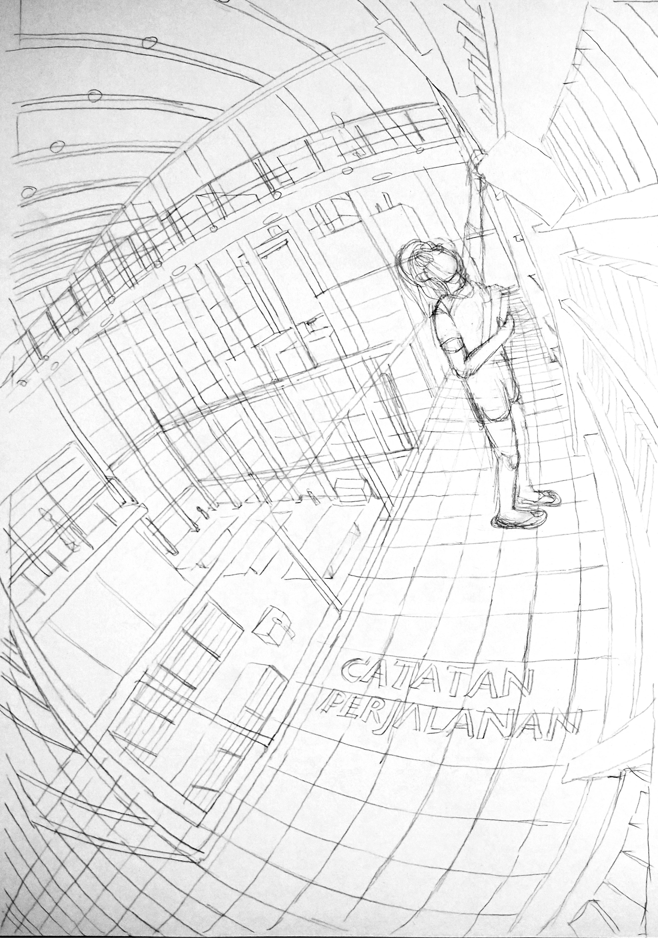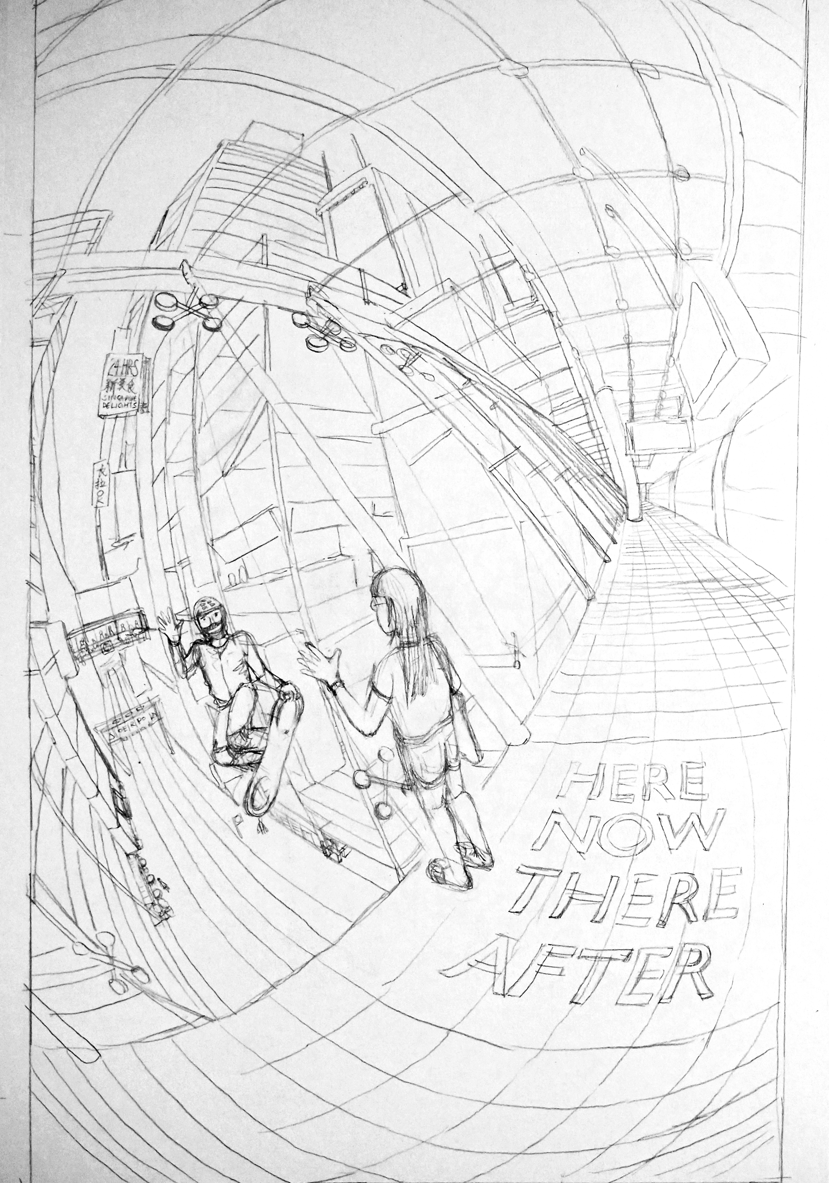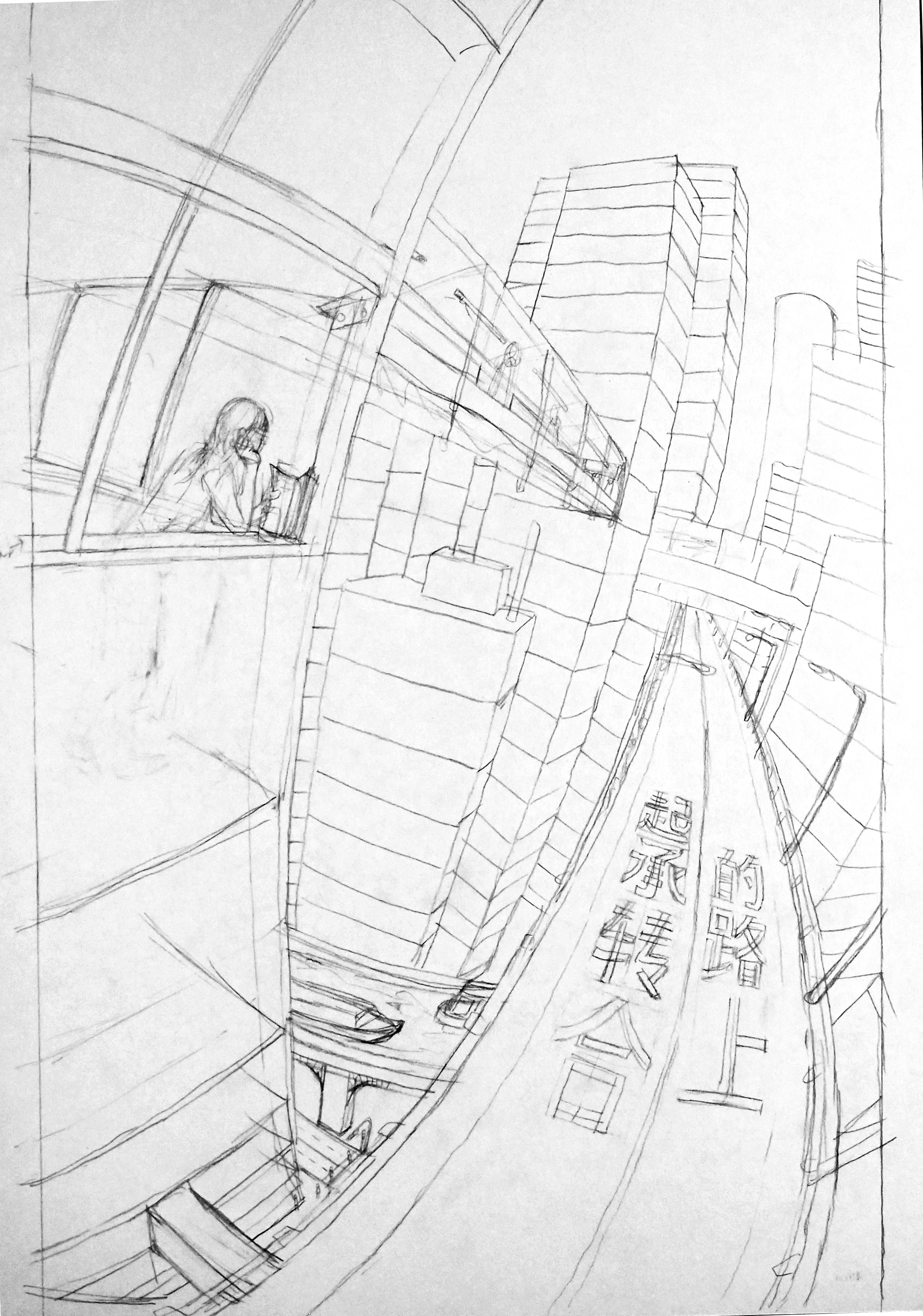 Blender was used to layout the intended perspective before I drew the works by hand on paper.