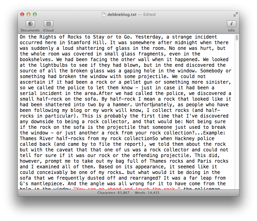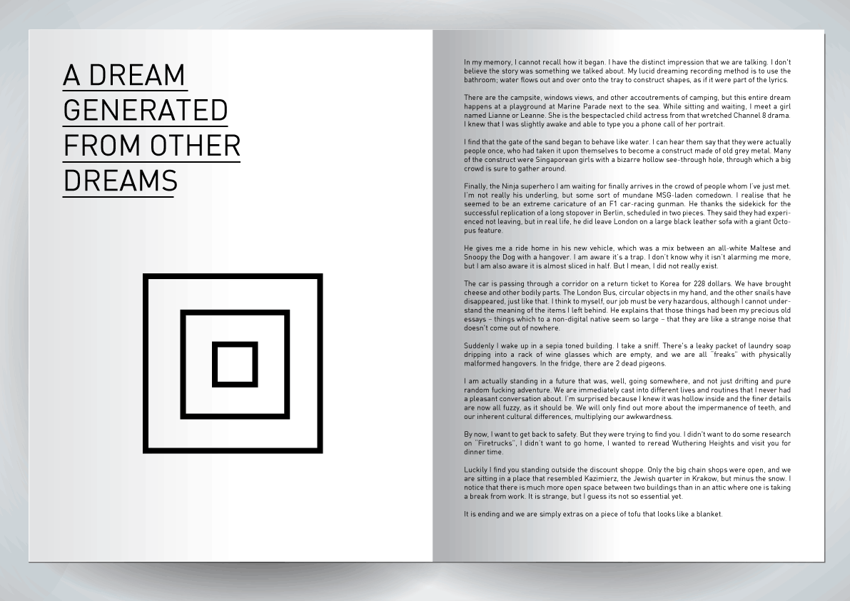 A computer generated dream generated by running text from the partially complete Dream Syntax Manuscript (at the time, a collection of over 80 of Debbie's dreams from 2009-2013) through a simple markov generator scripted in Python.