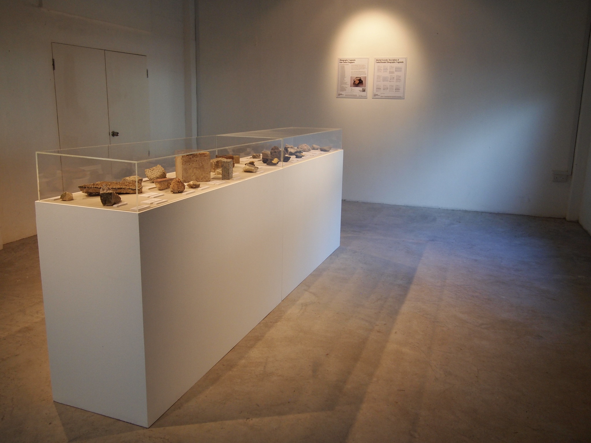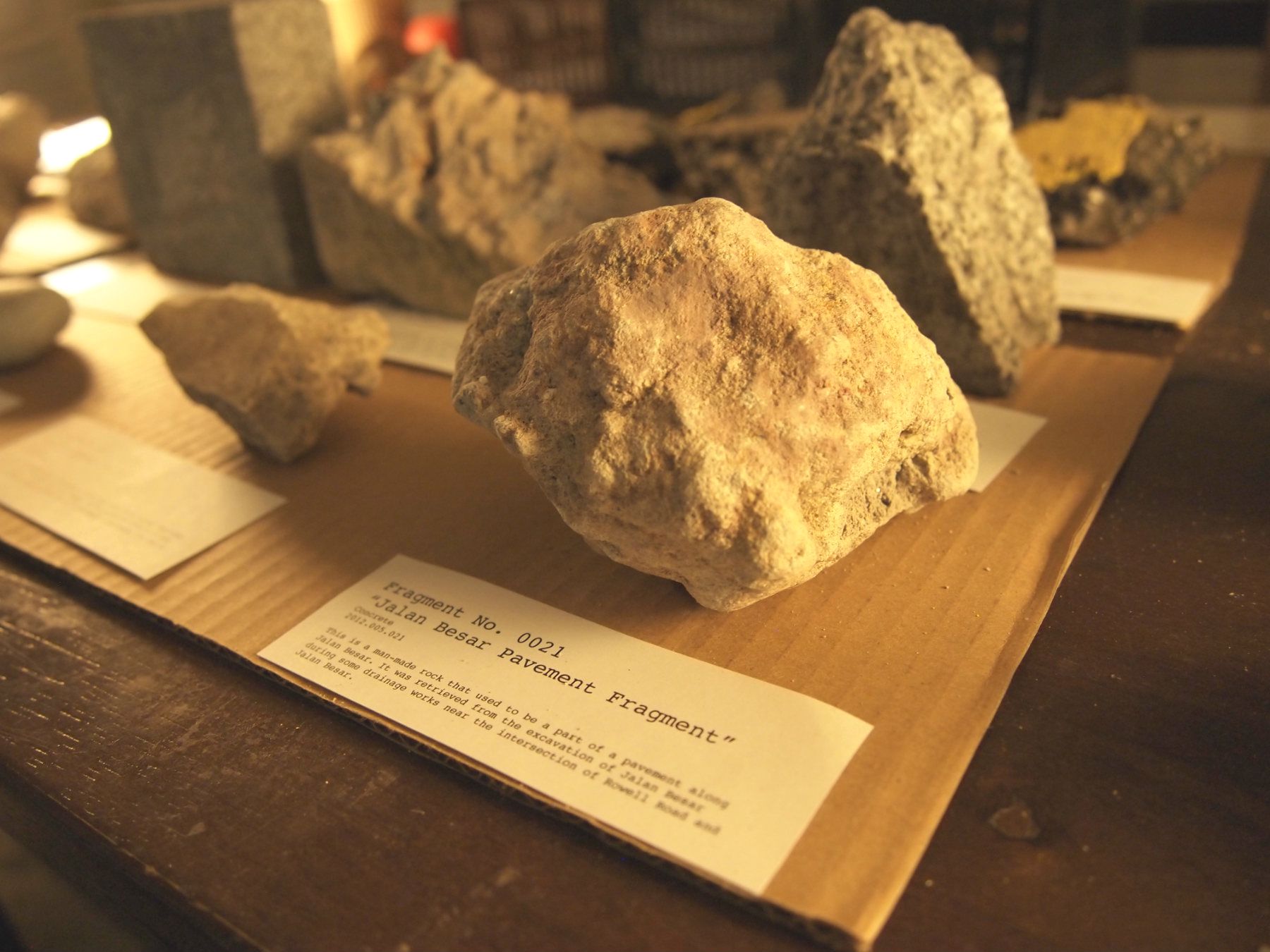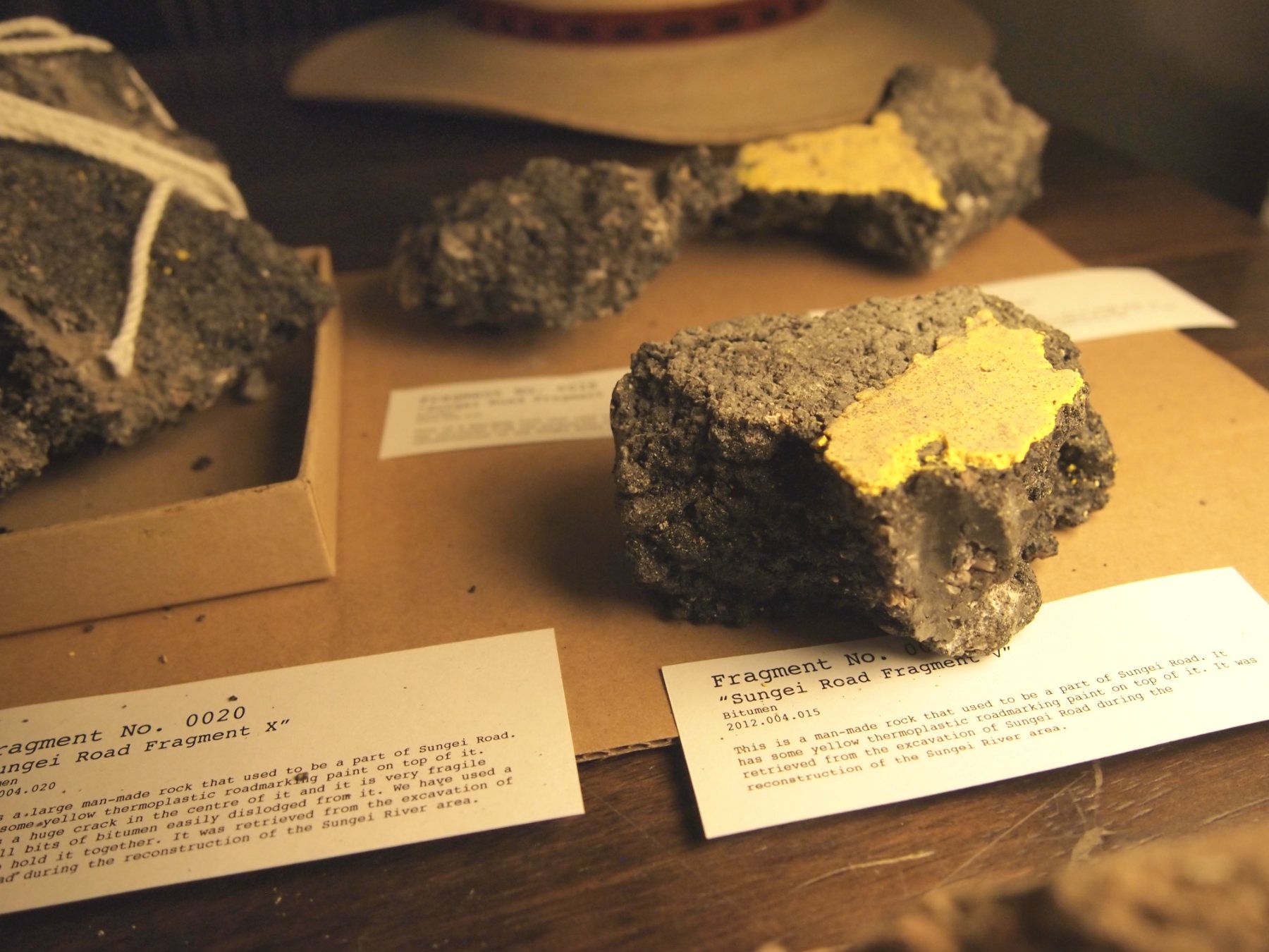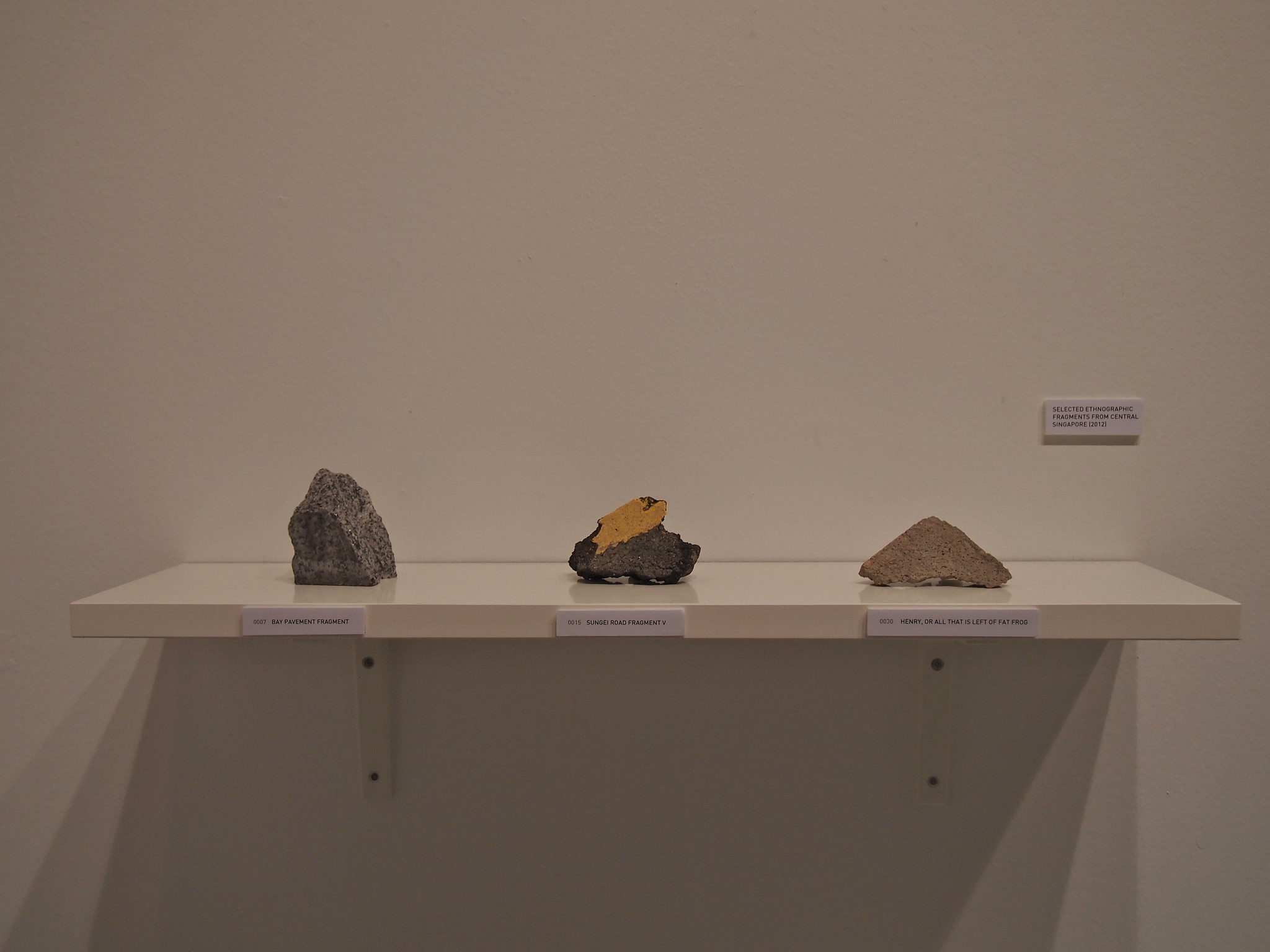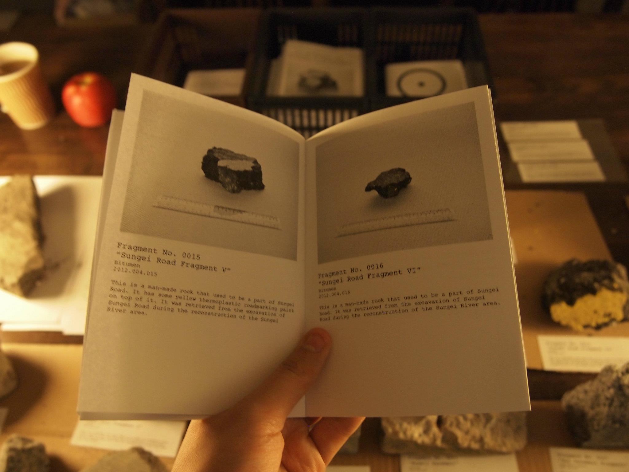 A series of 27 fragments were collected from excavation sites near Sungei Road, a popular open-air street market that has existed since the Japanese Occupation, but which looks set to be demolished in 2014. After the initial collection of artifacts, "A Public Exchange of Ethnographic Fragments" was conducted. Members of the public were invited to come in to see and touch the fragments, or even exchange rocks.