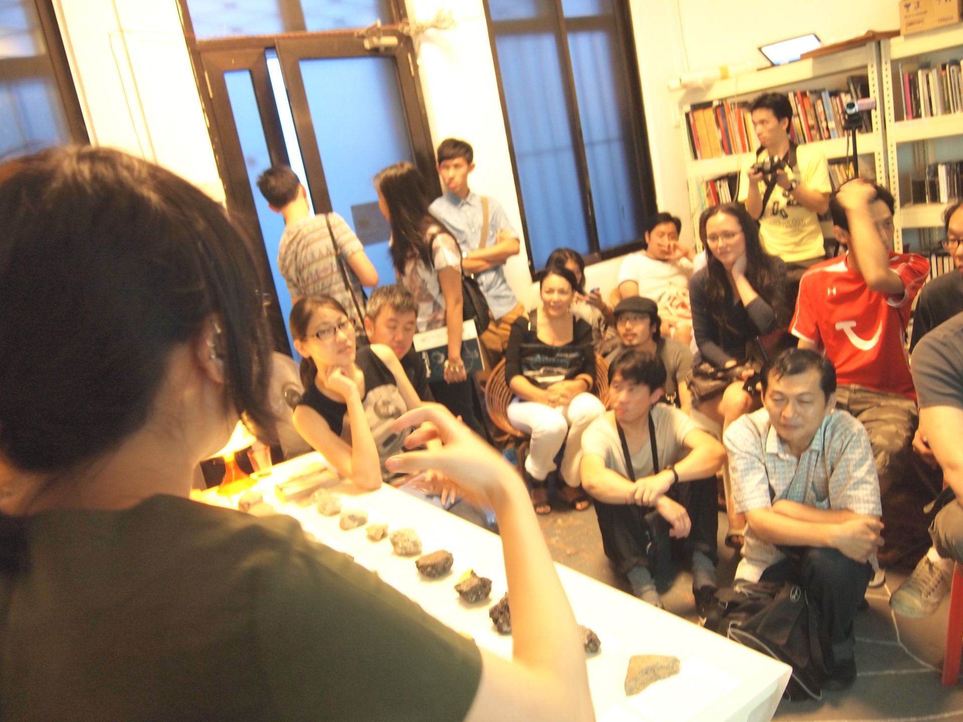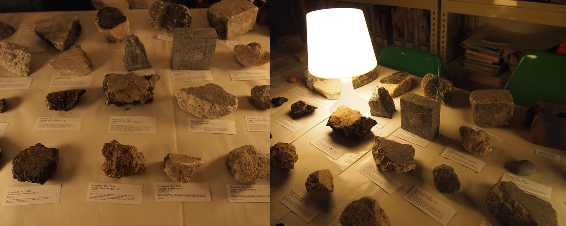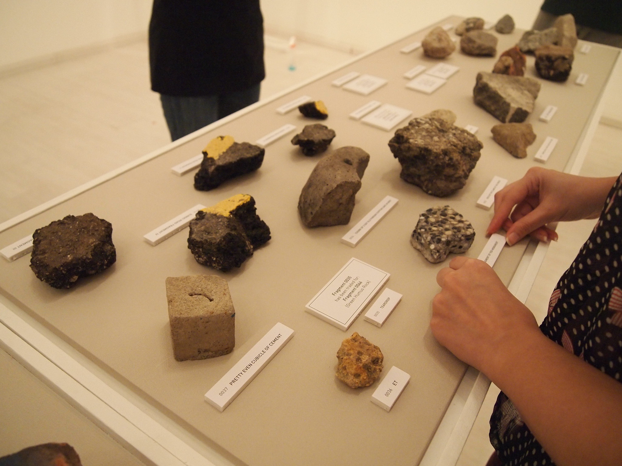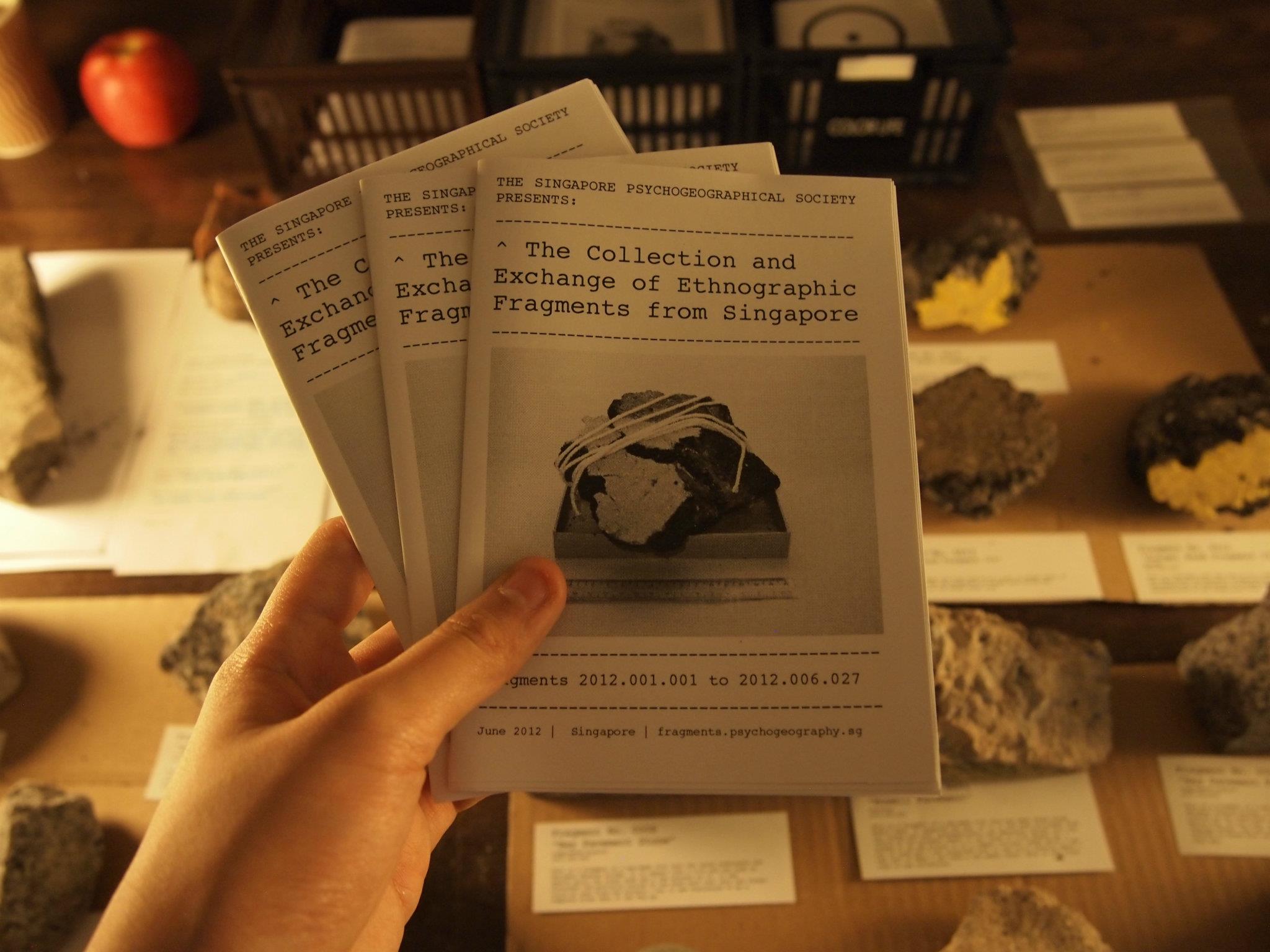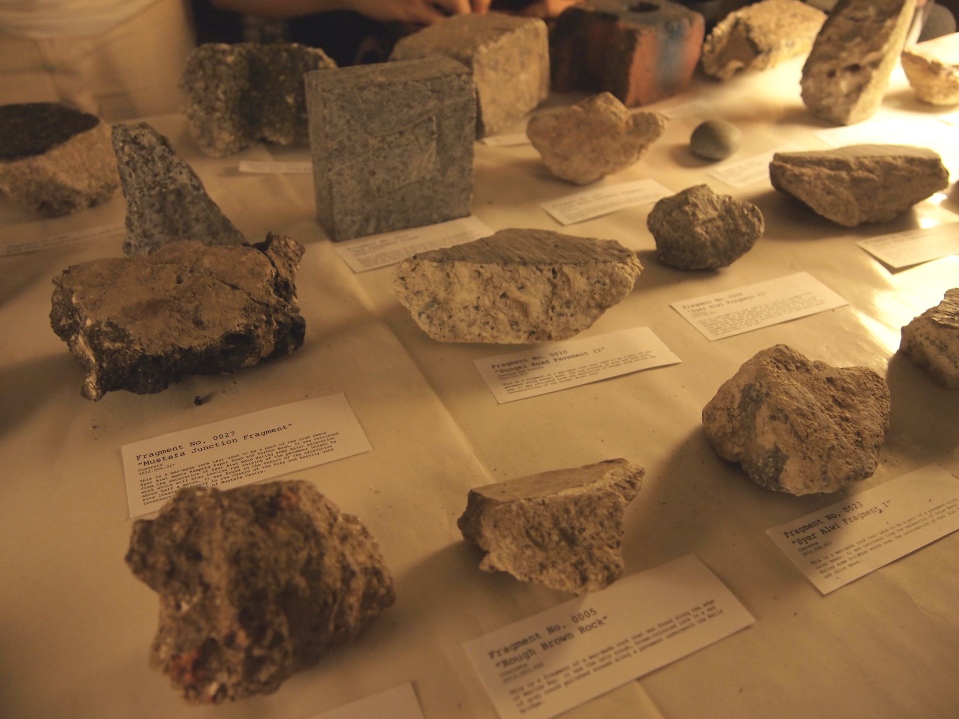 A series of 27 fragments were collected from excavation sites near Sungei Road, a popular open-air street market that has existed since the Japanese Occupation, but which looks set to be demolished in 2014. After the initial collection of artifacts, "A Public Exchange of Ethnographic Fragments" was conducted. Members of the public were invited to come in to see and touch the fragments, or even exchange rocks.
