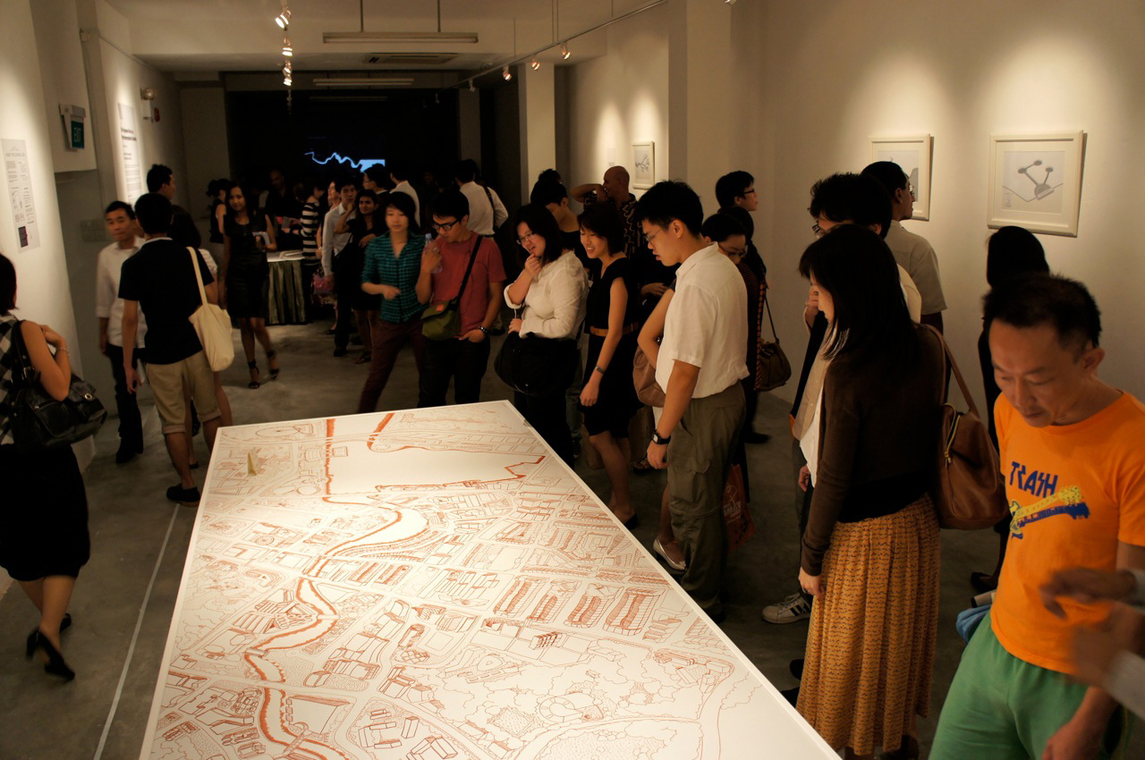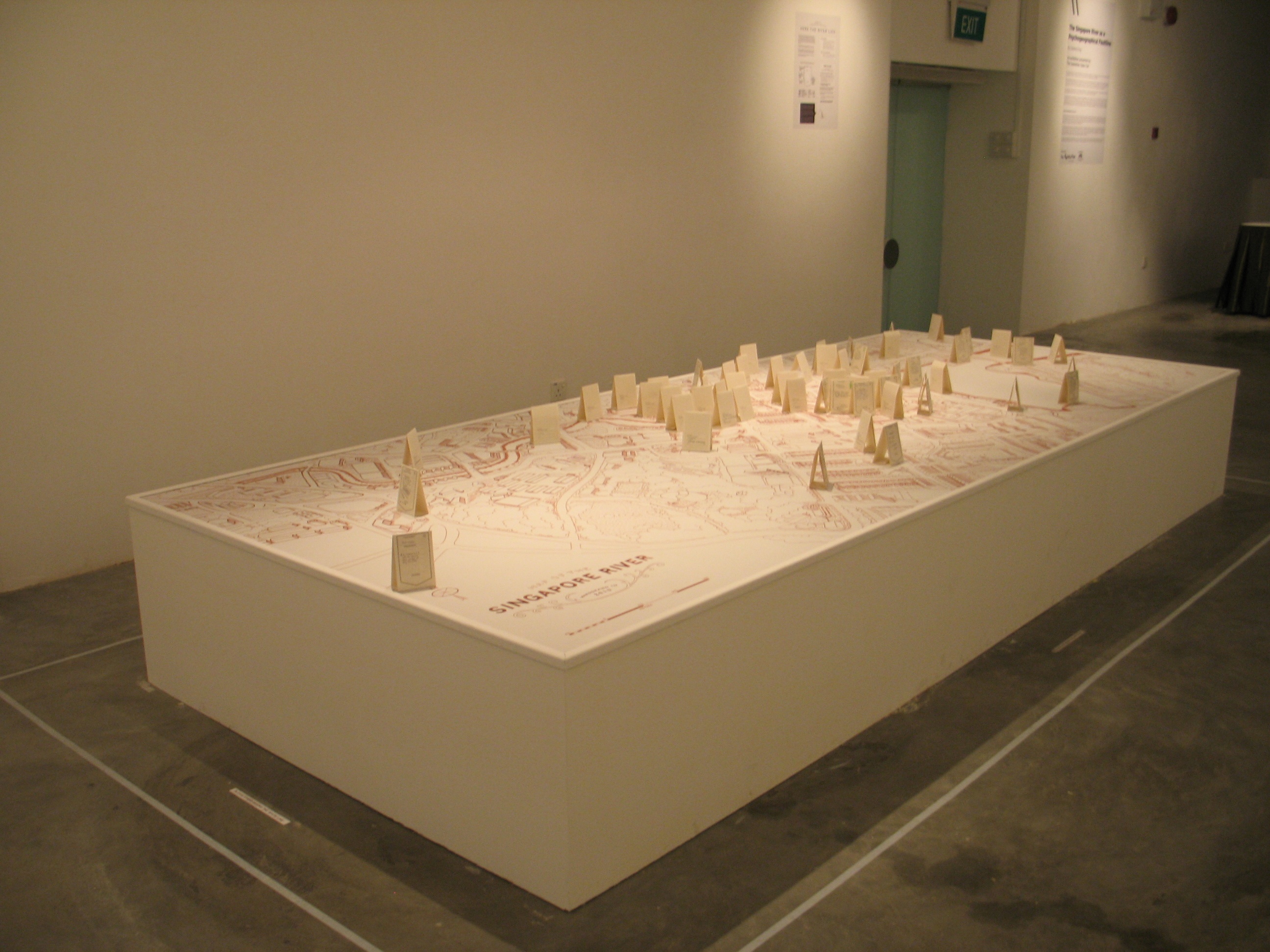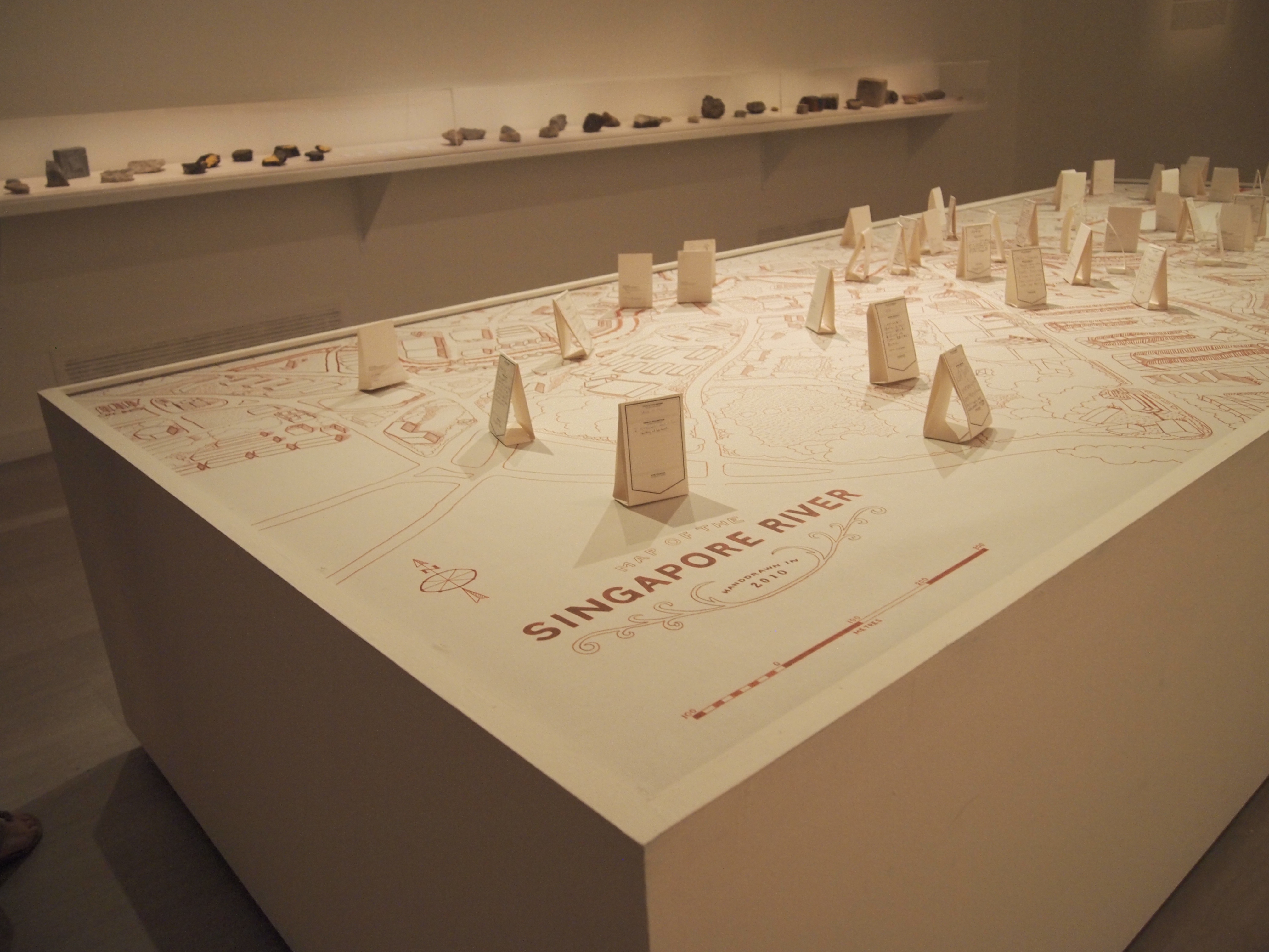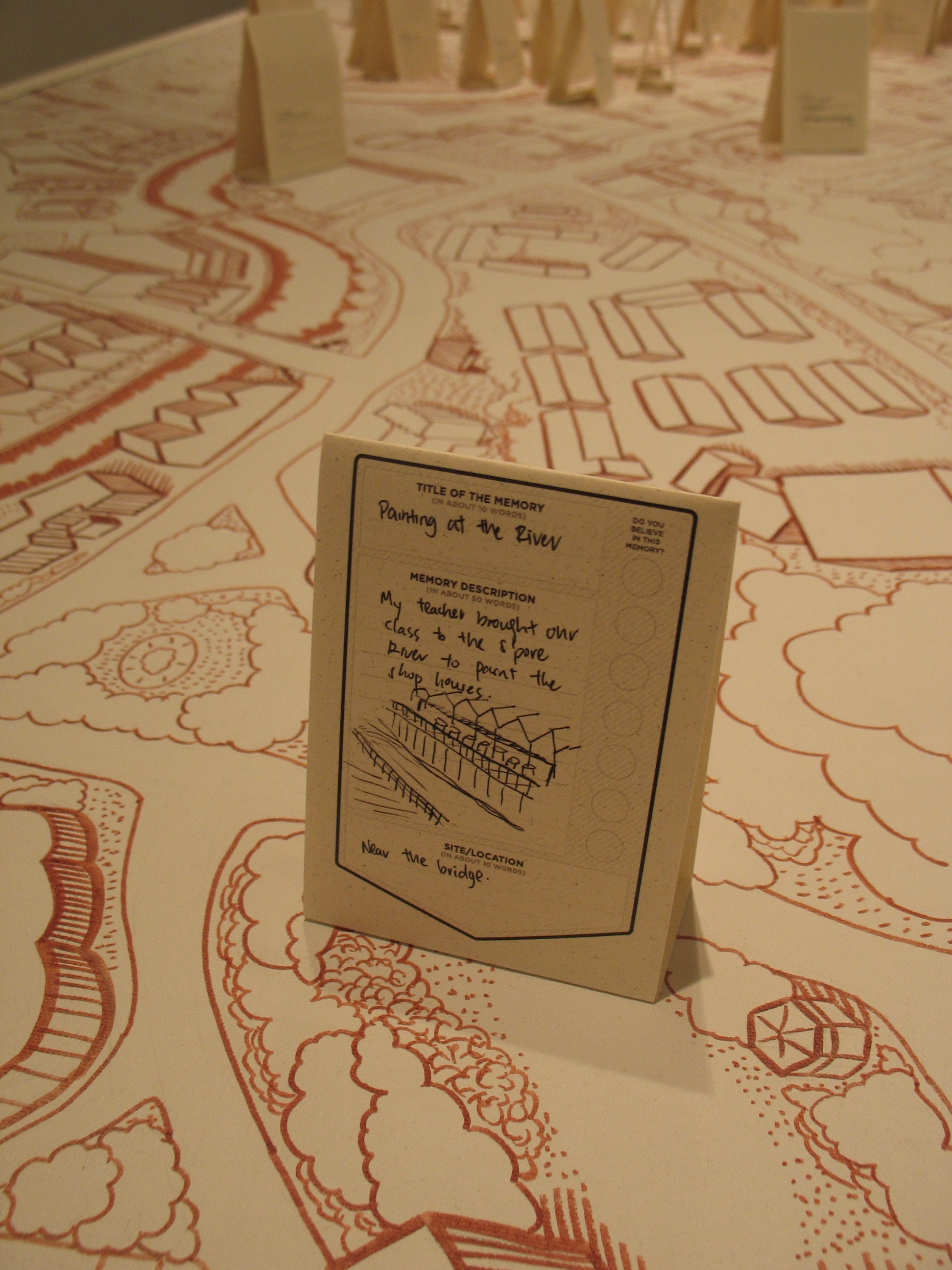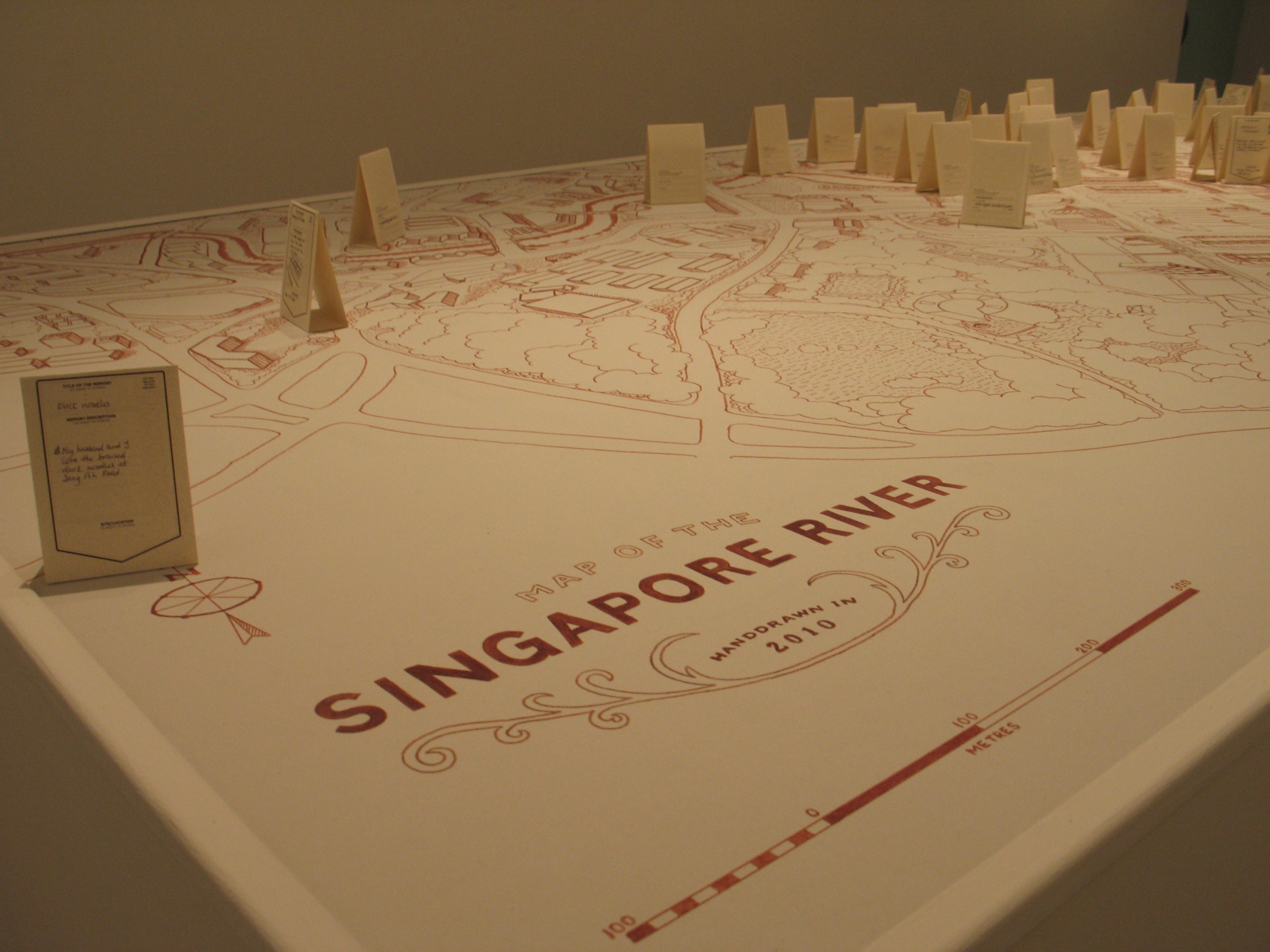 Here the River Lies is an interactive map installation of the Singapore River that requires the participation of the audience to complete the work. The audience is invited to contribute their memories of the Singapore River to a large hand-drawn map of the Singapore River, regardless of whether the memories are real, partially real, or imaginary.