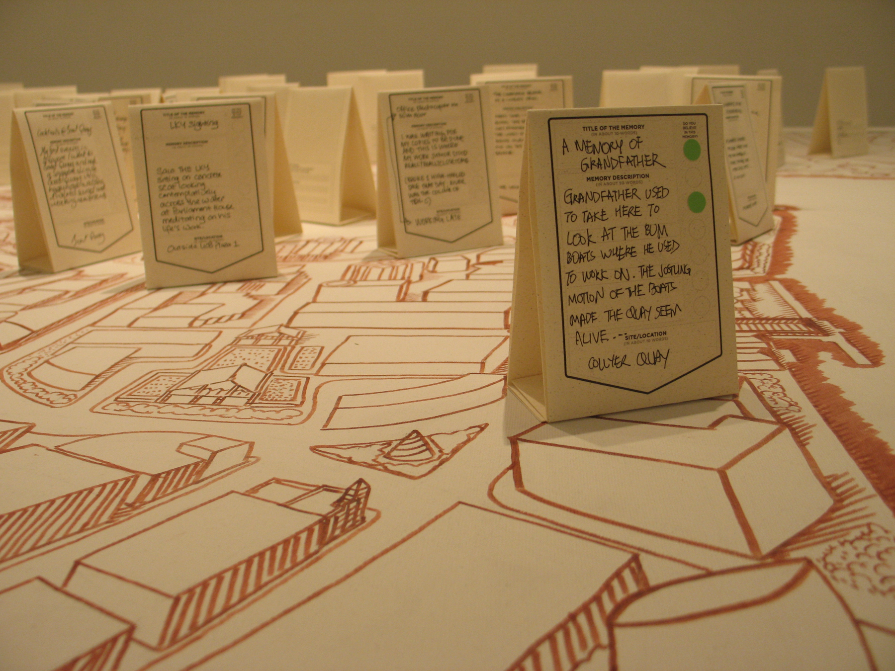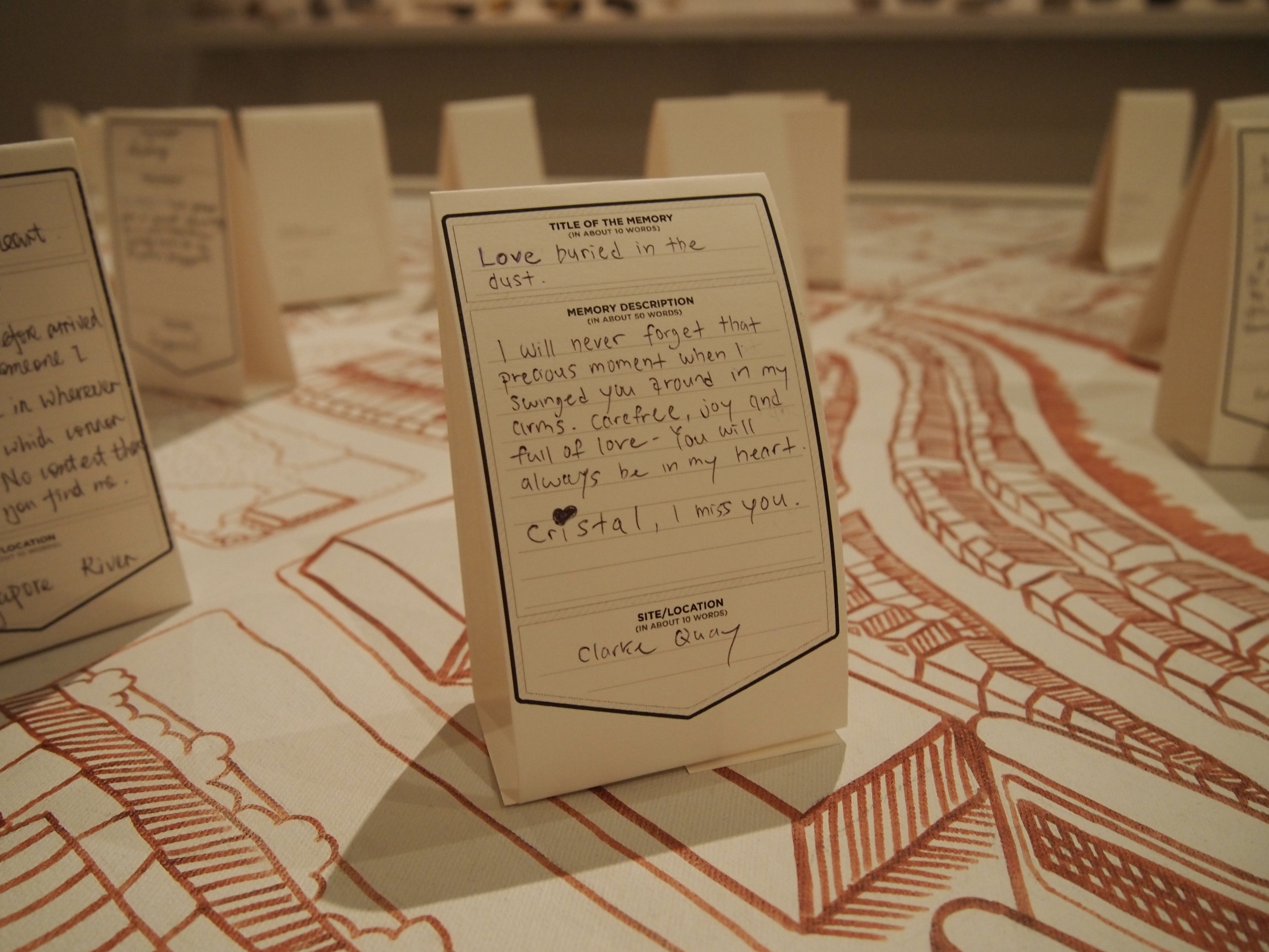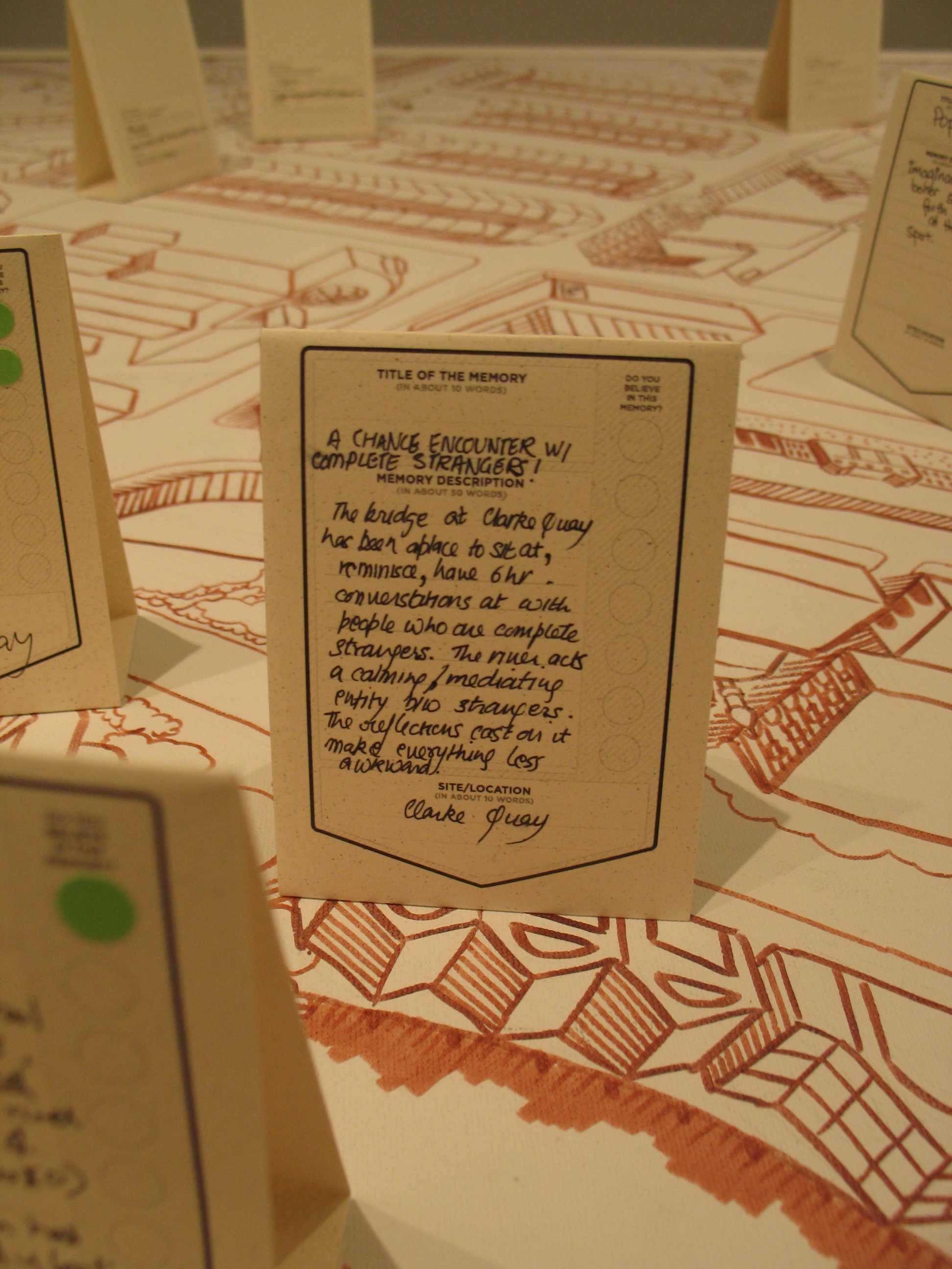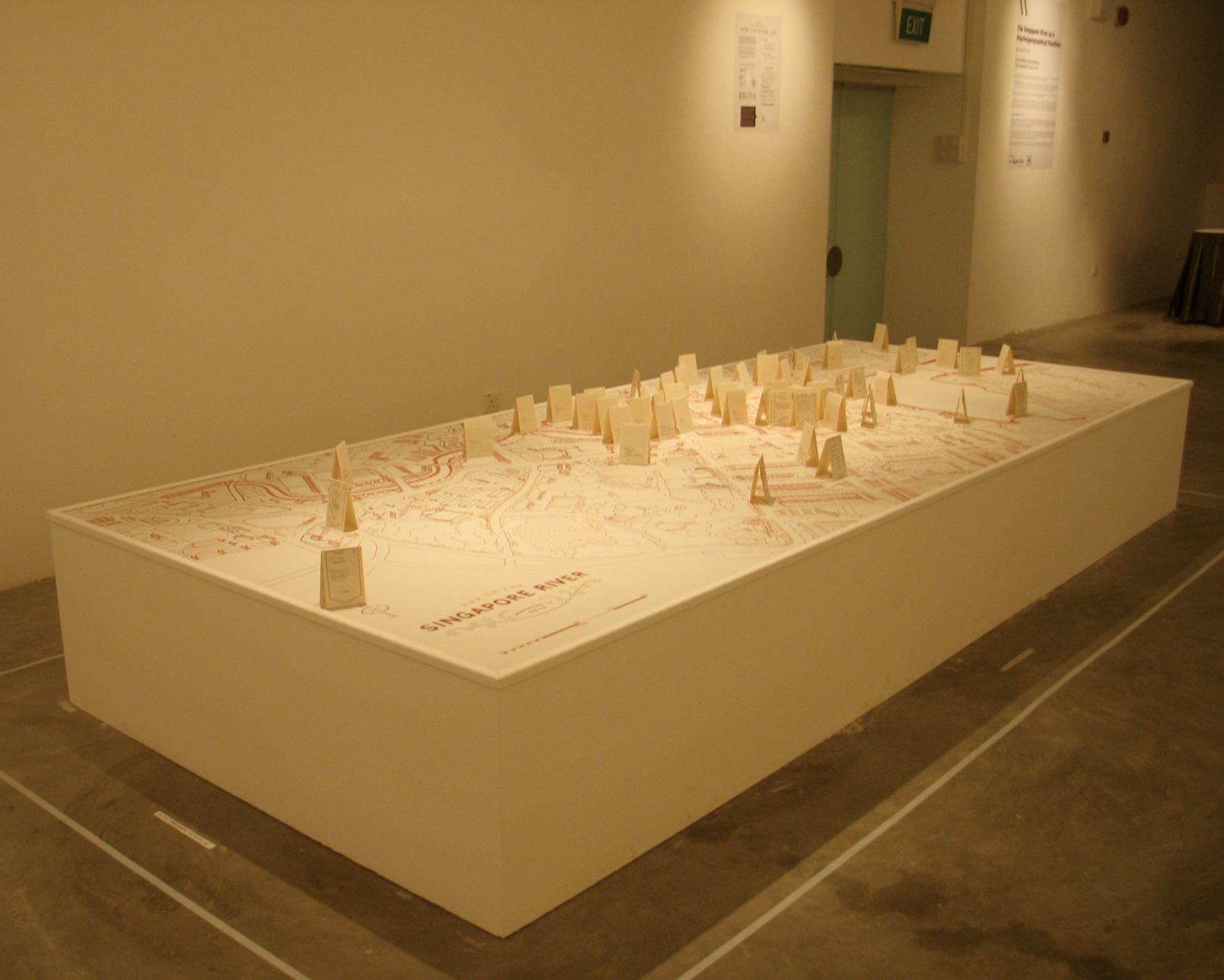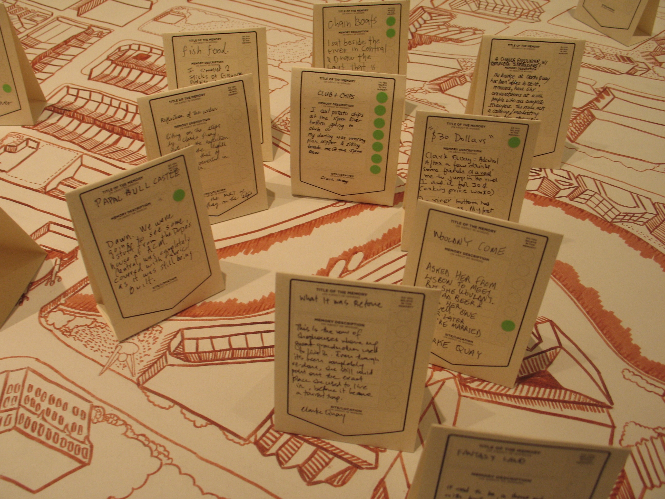 Here the River Lies is an interactive map installation of the Singapore River that requires the participation of the audience to complete the work. The audience is invited to contribute their memories of the Singapore River to a large hand-drawn map of the Singapore River, regardless of whether the memories are real, partially real, or imaginary.