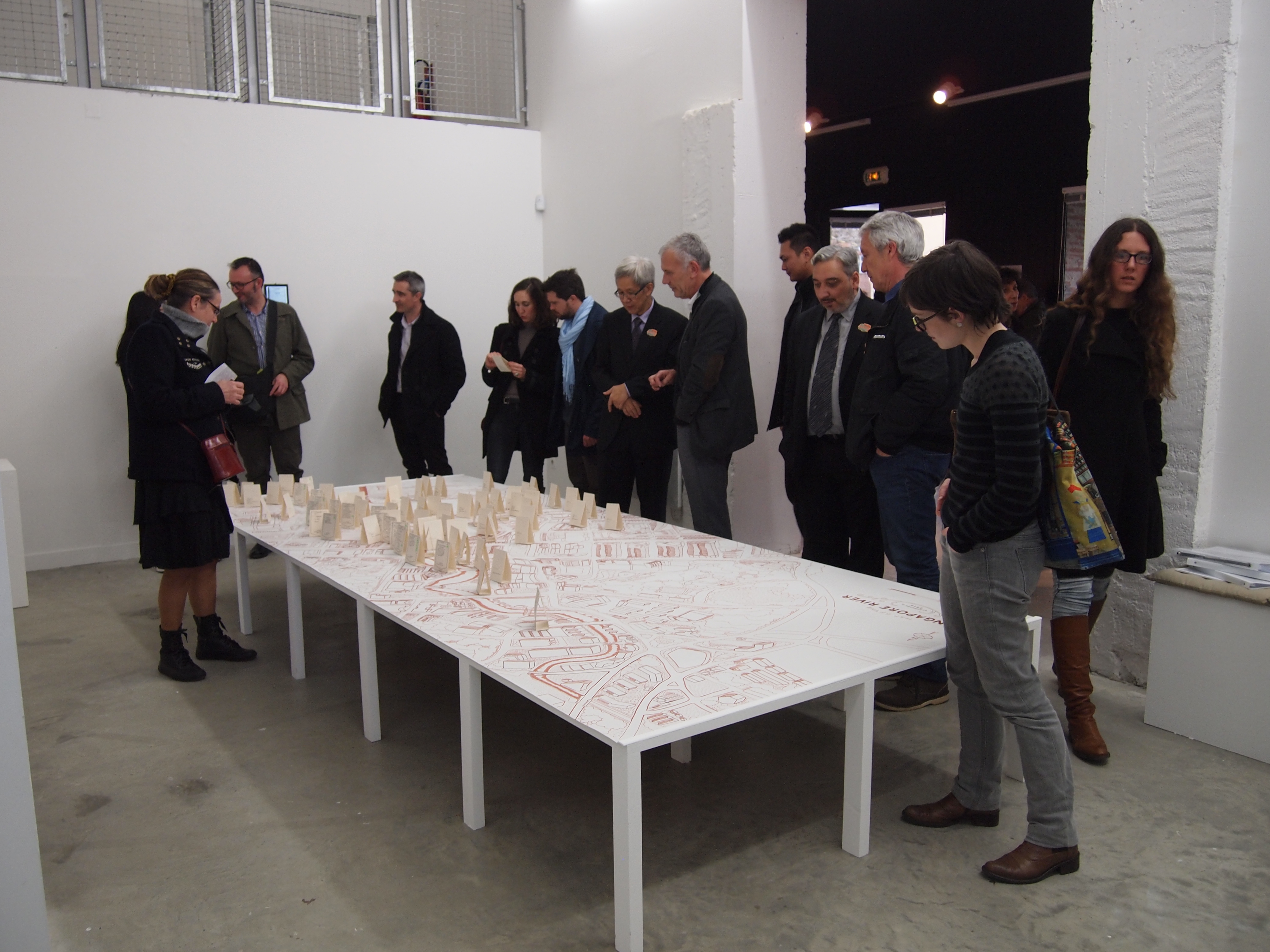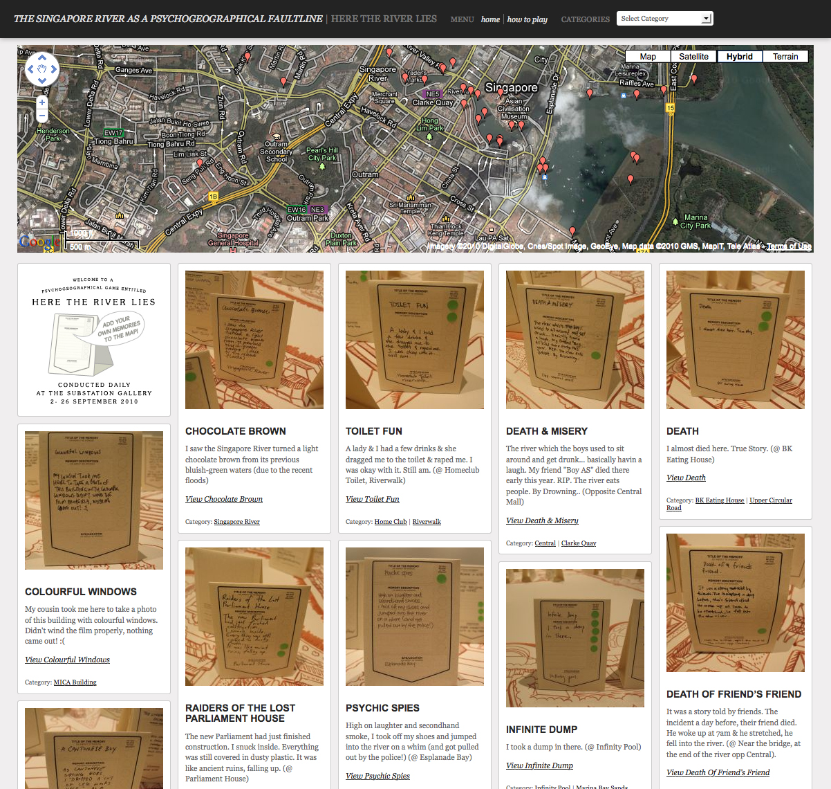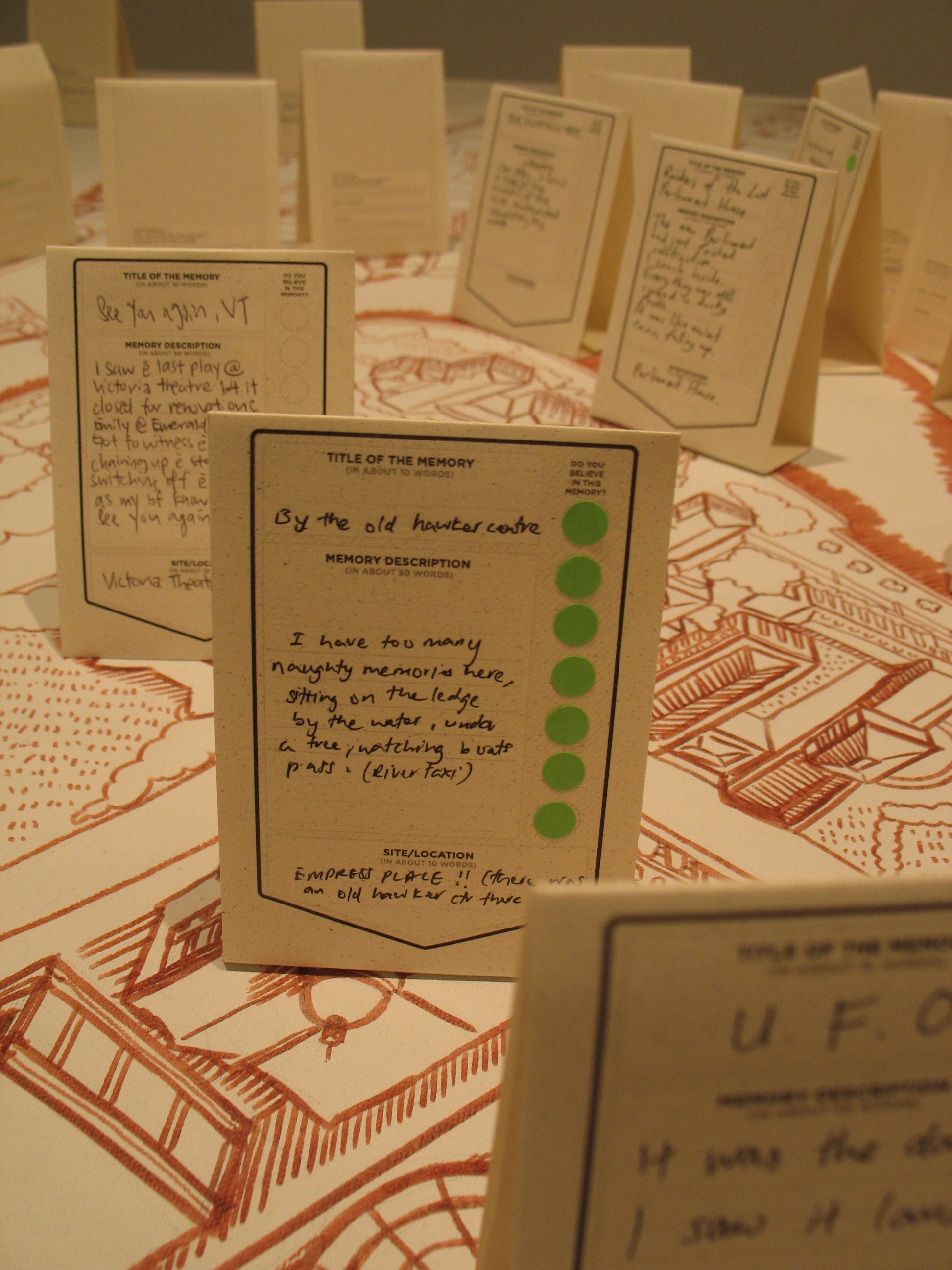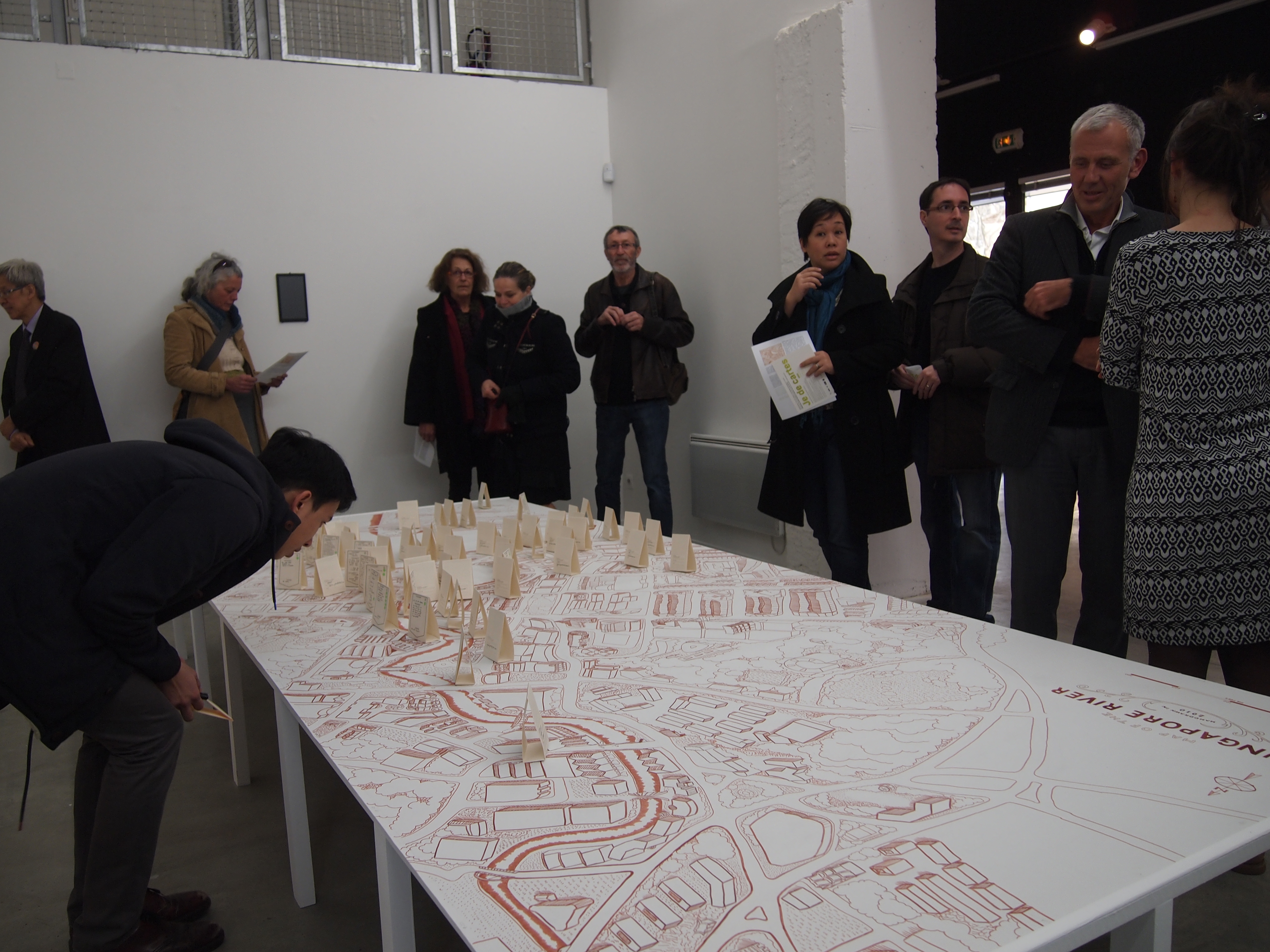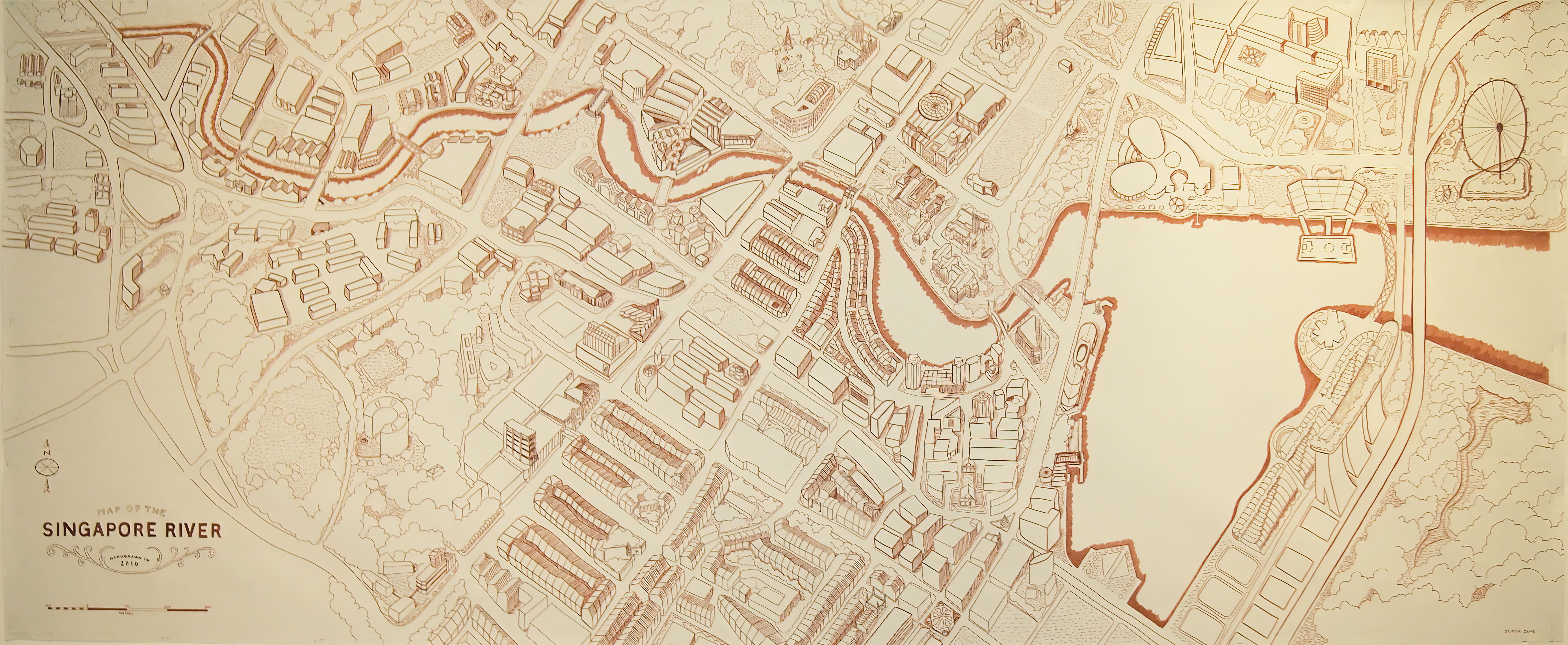 Here the River Lies is an interactive map installation of the Singapore River that requires the participation of the audience to complete the work. The audience is invited to contribute their memories of the Singapore River to a large hand-drawn map of the Singapore River, regardless of whether the memories are real, partially real, or imaginary.