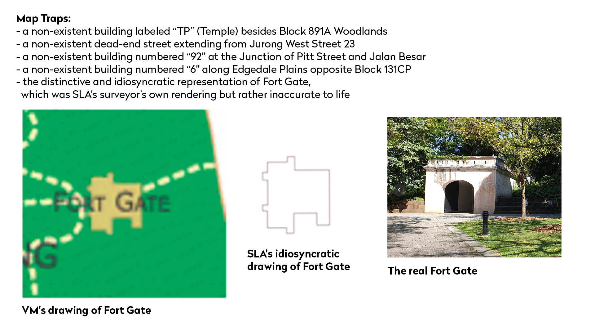In October 2006, the online mapping company Virtual Maps Pte Ltd was embroiled in a civil lawsuit with Singapore Land Authority for the copyright infringement of vector map data that was originally provided by SLA to Virtual Maps in 2004. This was proved with the SLA revealing that they had inserted some imaginary features into their maps - such as a fake temple, fake buildings, and a fictional dead-end street. It was argued that the addition of these fake features were not meant to mislead regular users of the map, but served as “fingerprints” which would help identify it to the owner of the map.