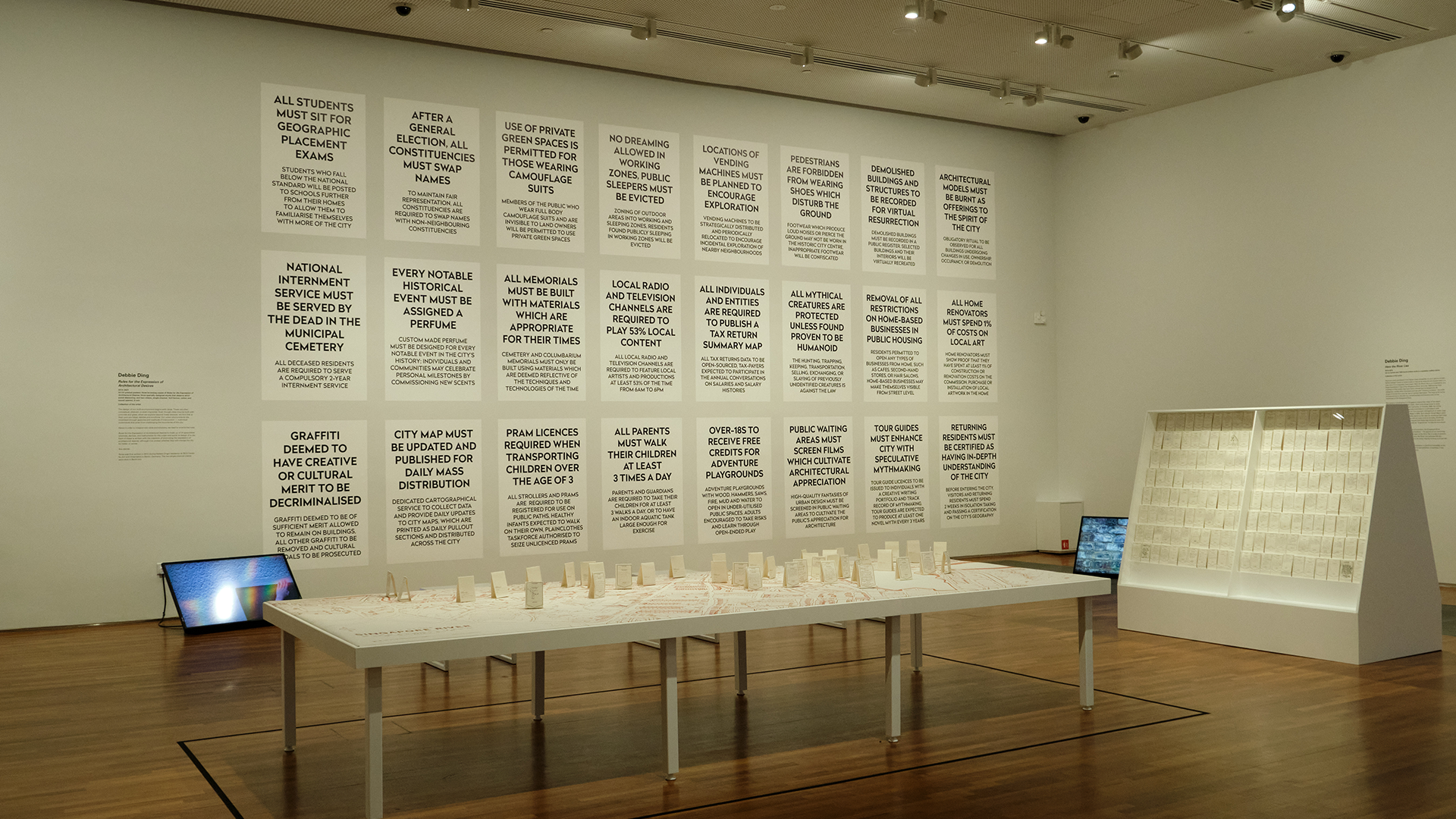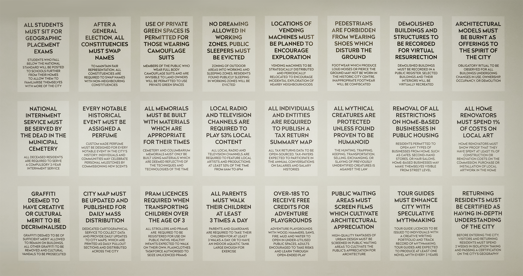 The time is neither future nor past. The place is neither East nor West. The design of our built environments begin with ideas, and these ideas are articulated in ways which may be conceptual, fuzzy, or imprecise. What we find is that the material of a city is immaterial at its very core. Our attempts to define rules for society precede every action, motion or change in our urban environment, and our urban experiences can be altered when we change the manner in which we define a city. Rules for the Expression of Architectural Desires is a selection of 24 speculative rules, schemes, devices and instruments for the urban and social design of a city, accompanied by two videos.