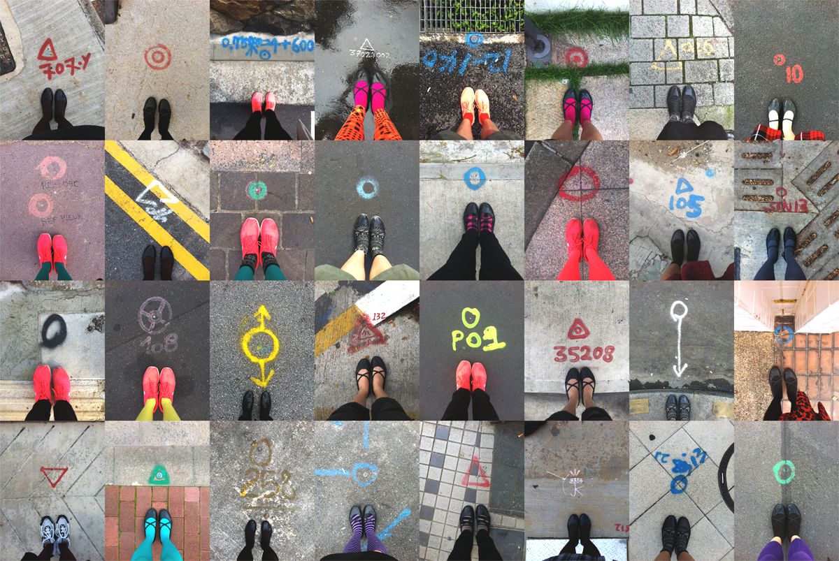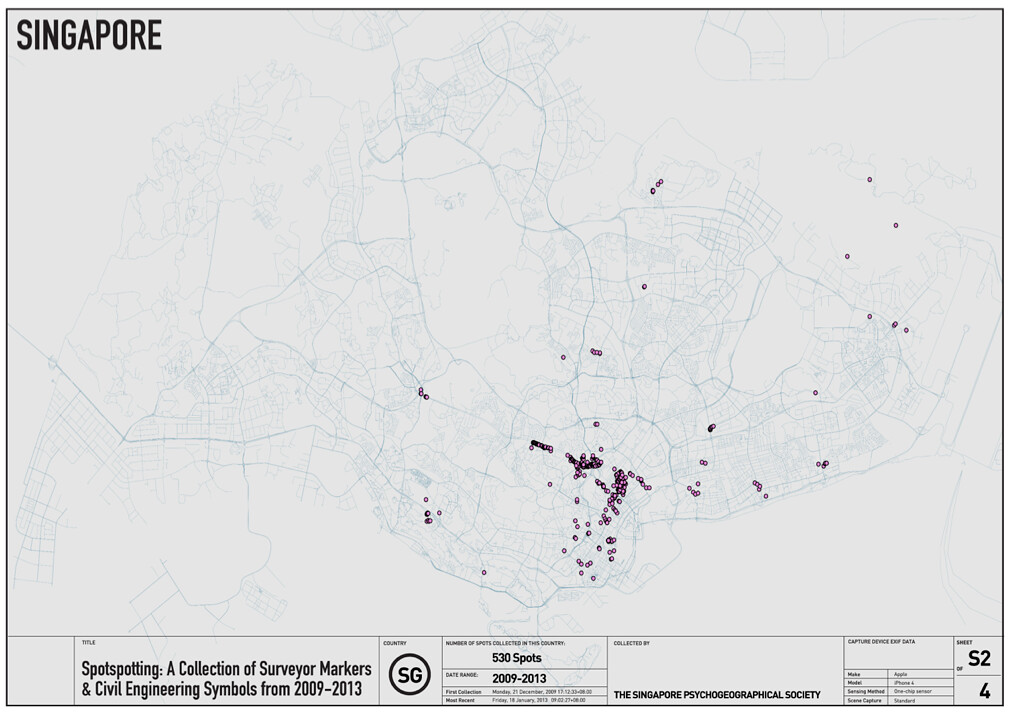 Spotspotting is an ever-growing archive of 616+ urban markers collected and mapped from 2009 to 2013 in cities such as Singapore, London, Paris, Berlin, Seoul, and Jakarta. These markers can be seen all over urban cities; usually only temporary and used as informal guides for people working in construction, civil engineering, or surveying, these symbols can also be considered as the most honest, authentic form of graffiti that can still be found in a city like Singapore. The work celebrates the search for these small landmarks and monuments of everyday city life by archiving and mapping these signs.