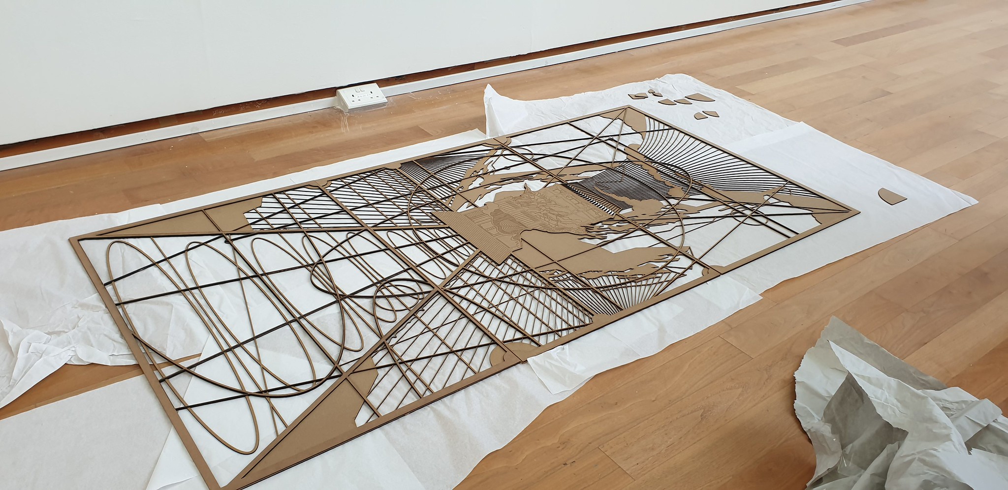 I wanted to make a mysterious diagram, depicting an arts centre as a kind of haunted machine, or diabolical signal processing hardware; a machine into which all the ideas and intentions of the artists and arts programmers and artistic director trickled into... or maybe not so gently. Maybe the energies of all these artists and programmers and art workers were being uncontrollably sucked up into, brutally chewed up, and then this big machine spat it all out as art, scattering it randomly into the sky, broadcasting it far and wide, without total control on how it rained down or haphazardly drizzled upon the audiences.