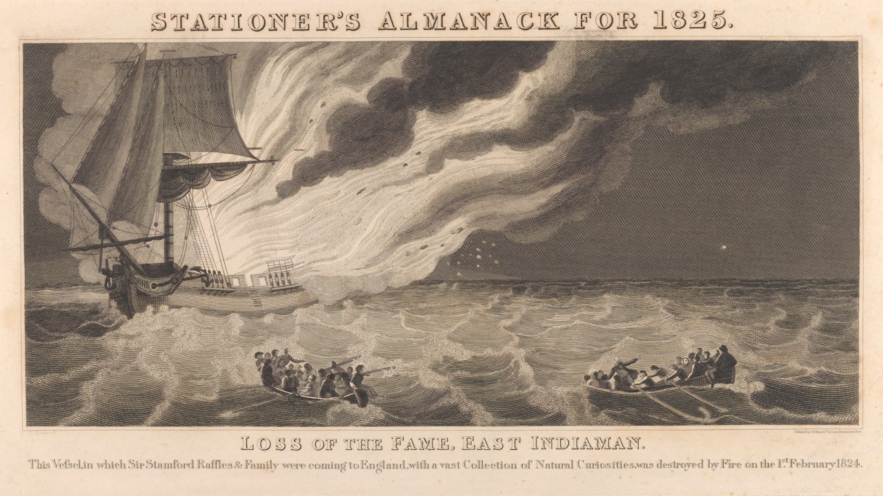 Harder to inventorise was the loss of all of his personal papers, correspondences, notes, memos, records of administration, and collection of drawings. He also hired draftsmen and artists to recreate some of the over 2000 maps and natural history illustrations which were lost on the Fame, attempting to recover as much of his collection as possible within 10 weeks before the next ship came to take him home. Today, the surviving documents which form part of Raffles’ attempts to re-capture the imaginary tropical for a British audience across the seas are now largely stored in the British Library. The challenges that Raffles faced foreground the precarity of colonial expeditions and the risks involved in the endeavour of trying to move a huge quantity of field collections across the ocean.