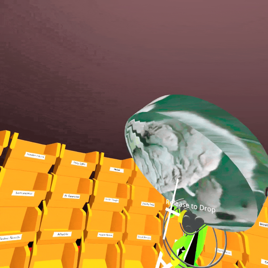 “The Collector” is a VR game in two parts. In “The Sorter”, you play as an agent inside an Unforgetting Machine, sorting commodities into nonsensical but serendipitous categories. In “The Collector”, you’re onboard a modern-day Fame, where you can generate an infinite flow of commodities with ease. But beware: if you force the machine to generate more commodities than the boat can hold, the boat will catch fire, and you have no choice but to go under…