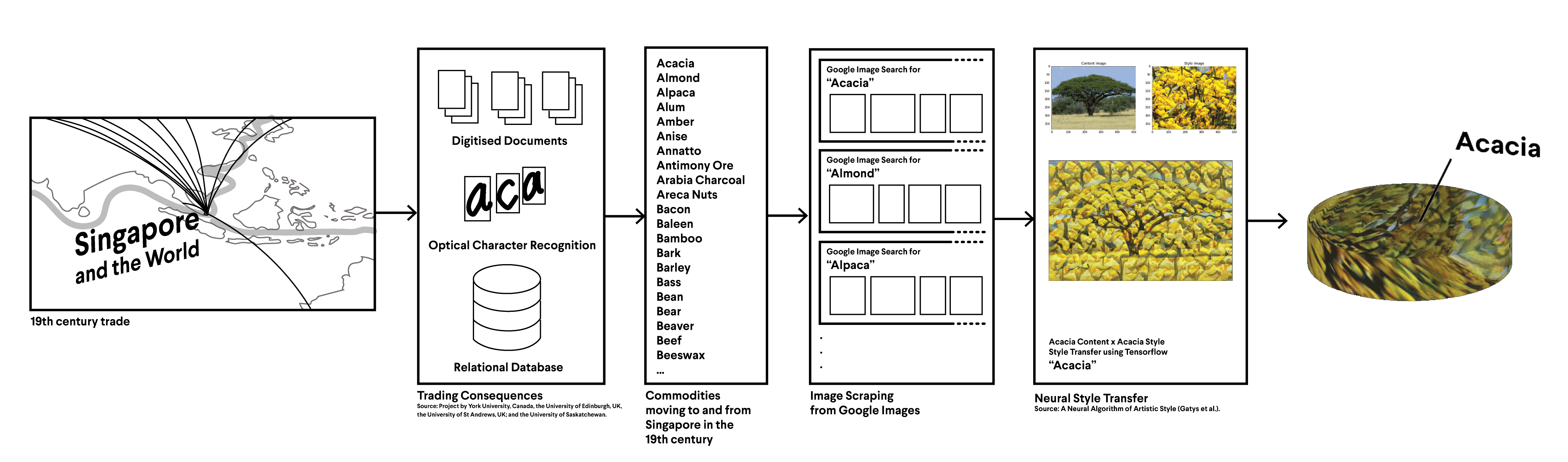 With a hands-on understanding of tropical commodities becoming increasingly out of reach, I wanted to produce an interactive experience where the player could visually explore representations of commodities and the lost tropical imaginary. Using data from “Trading Consequences”, a big data project on international commodities in the British Empire during the 19th century, commodities that flowed in and out of Singapore in the 19th century are re-imagined through google image scrapings and neural style transfer.
